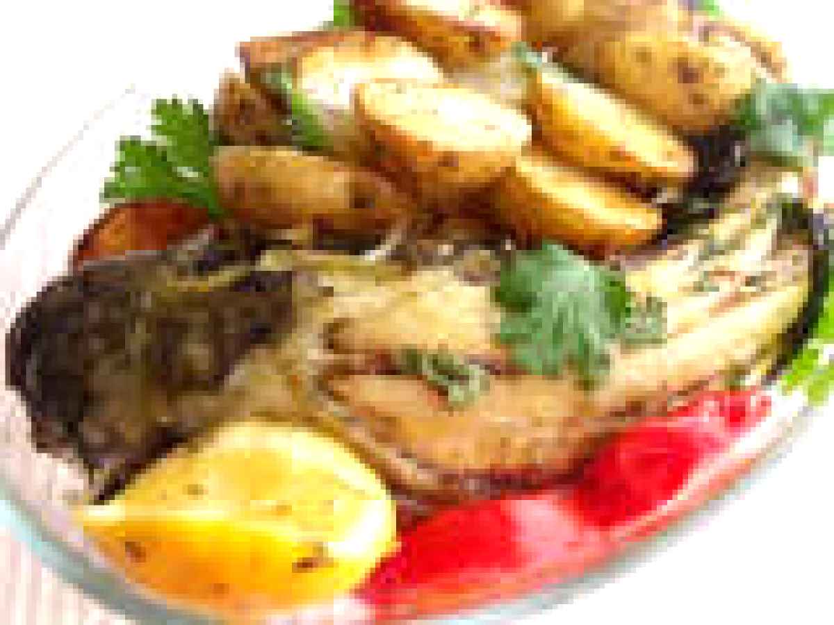 Zilele trecute am cumparat de la piata un peste din familia chefalului,banuiesc a fi varianta cu "capul mare", pe care l-am pregatit in cel mai simplu mod:l-am frecat pe toate partile cu un amestec de 3 lingurite ulei de masline,1 lingurita de sare,rasa,1/2 lingurita de piperproaspat risnit(varianta mozaic),3 lingurite de ierburi de Provencesi l-am umplut cu felii de rosii si lamiie(mi-au trebuit 1 rosie si 1 lamiie).si dupa ce l-am tinut la rece vreo 2 ore l-am plasat in cuptorul VITA COOKpentru 25-30 de minute,la 175 grade.de vreo 3 ori am ridicat capacul si l-am mai pensulat cu amestecul din tava(pielea bietului chefal a cam crapat,de necaz sau de temperatura,oare?).intre timp am pregatit si garnitura,am spalat citiva cartofi noi si i-am facut la aburi,cca 20 minute.dupa care i-am perpelit 5 minute in 2 linguri de masline ,in prealabil fiind morfoliti si ei cu ceva ierburi de Provence ,sare si piper.aranjam totul intr-un platou,decoram cu frunzulite verzi, gata prinzul,va invit la masa!