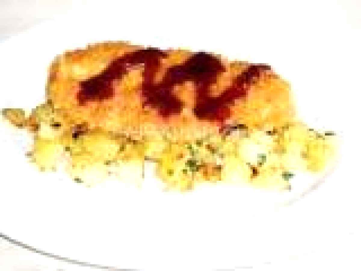 Chicken katsu e un ?ni?el japonez din piept de pui servit cu sos Tonkatsu. Acum traducerea: Tonkatsu este ?ni?el f?cut din cotlet de porc, dac? se face din carne de pui se nume?te Chicken katsu. El se deosebe?te de ?ni?elul obi?nuit prin faptul c? în loc de pesmet se folose?te Panko. Panko se poate face din miez de pâine toast r?zuit ?i l?sat la uscat. Se ob?in astfel buc??i mai mari decât în cazul pesmetului, care prin pr?jire devin foarte crocante. Sosul Tonkatsu este asem?n?tor cu sosul Worcestershire, fiind f?cut pe baz? de piure de mere. În Japonia Tonkatsu se serve?te cu sosul cu acela?i nume ?i varz? proasp?t? t?iat? feliu?e foarte sub?iri, între felii de pâine sau cu orez, ca parte a unui meniu.