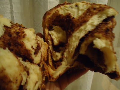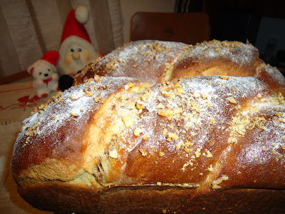 L-am numit cozonac fantezie pentru ca m-am apucat sa fac acest cozonac dupa ce mi-a facut pofta Nico cu cozonacul ei,cand am vazut pozele cozonacului ei pe blogul ei(agenda di nico) mi-a venit o pofta nebuna de cozonac,am mers in bucatarie si am inceput aventura cozonacului fantazie,cu ceea ce aveam in casa(caci nu mereu ai incasa tot ce-ti trebuie pt a framanta cozonac),cu o reteta la ochi,am cantarit doar faina 1kg,zahar 270gr,drojdie 25gr,un praf de sare,arome,3 oua si lapte cu unt din ochi ,l-a, framantat fara prea multa bataie de cap,am batut zaharul cu galbenusurile,albusurile spuma cu 2 linguri de zahar,drojdia cu lapta caldut si apoi toate impreuna,timp de dospit cca 1 ora inaite si cca 1 ora dupa ce l-am pus in tavi ,timp de coacere 45-60 minute depinde ce cuptor,umplutura nuci macinate cu cacao,rom,zahar,un pic de lapte si ciocolata rasa