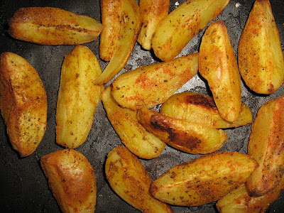 A doua zi, dupa 30 de minute la cuptor, cam asa aratau cartofii mei weges. Mai mergeau lasati putin: 5-10 minute maxim. Au fost buni si ceva mai sanatosi decat la Mac, caci au sarit peste baia de ulei. E ok, data viitoare pregatesc o cantitate mai mare ca sa o depozitez in congelator! Pofta Buna!