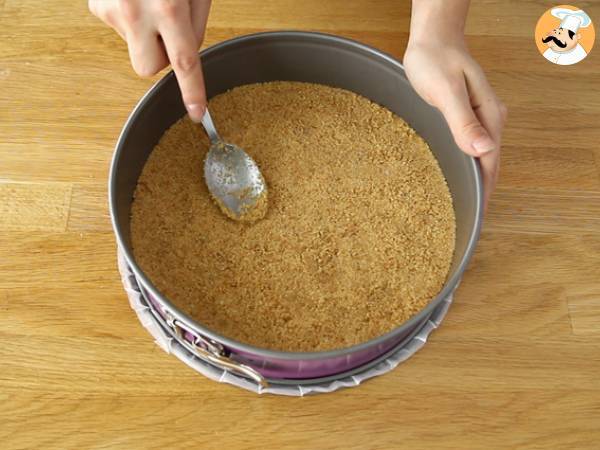 In partea de jos a tavii sau cercului, puneti o foaie de hartie de copt. Turnati amestecul de biscuiti si intindeti pentru a obtine un strat uniform și compact. Puneti in frigider.