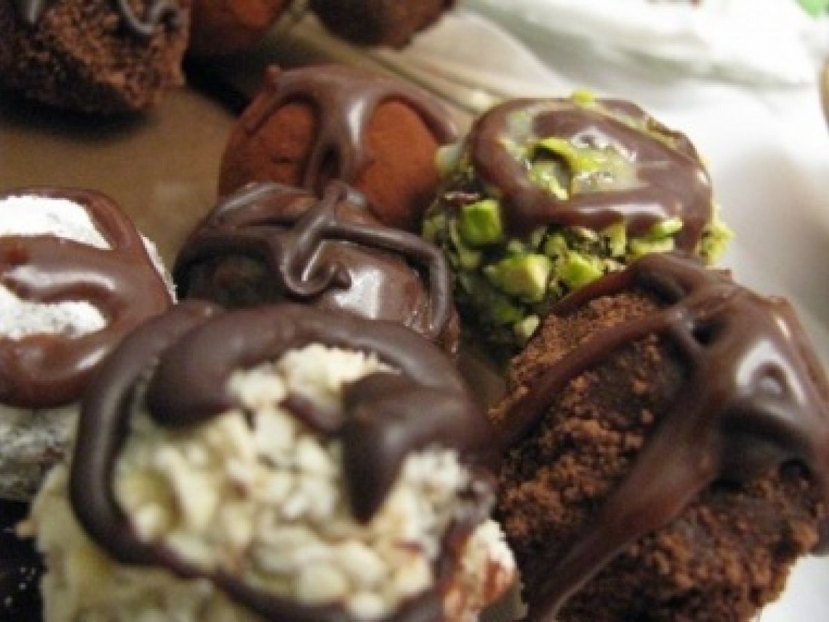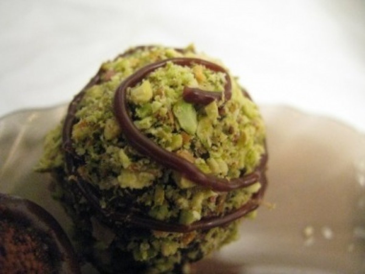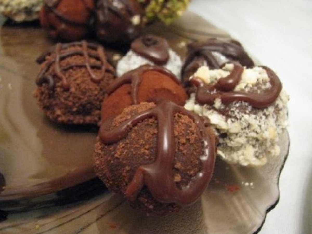 Bile de ciocolata PrecedentulUrmătorul DesertFoarte ușor3 zile 3 h 15 m Trimite unui prieten Printează pagina Adresează o întrebare autorului Postează o poză cu rețeta gătită de tine Ingrediente 6 Bile de ciocolata ¾ ceasca smantana lichida (pentru frisca) 250 g ciocolata amaruie, taiata in bucati SAU 150 g ciocolata cu lapte + 100 g ciocolata amaruie 2 lingurite coniac 1 lingurita esenta de vanilie sau 1 lingurita esenta de menta sau 1 lingurita esenta de migdale sau 1 lingurita esenta de portocale sau 1 lingurita esenta de cocos sau 1 lingurita esenta de rom Decorare 150 g ciocolata amaruie, cu lapte sau alba , taiata in bucati si topita nuci cajou si fistic, macinate Cacao si zahar pudra, pentru pudrare