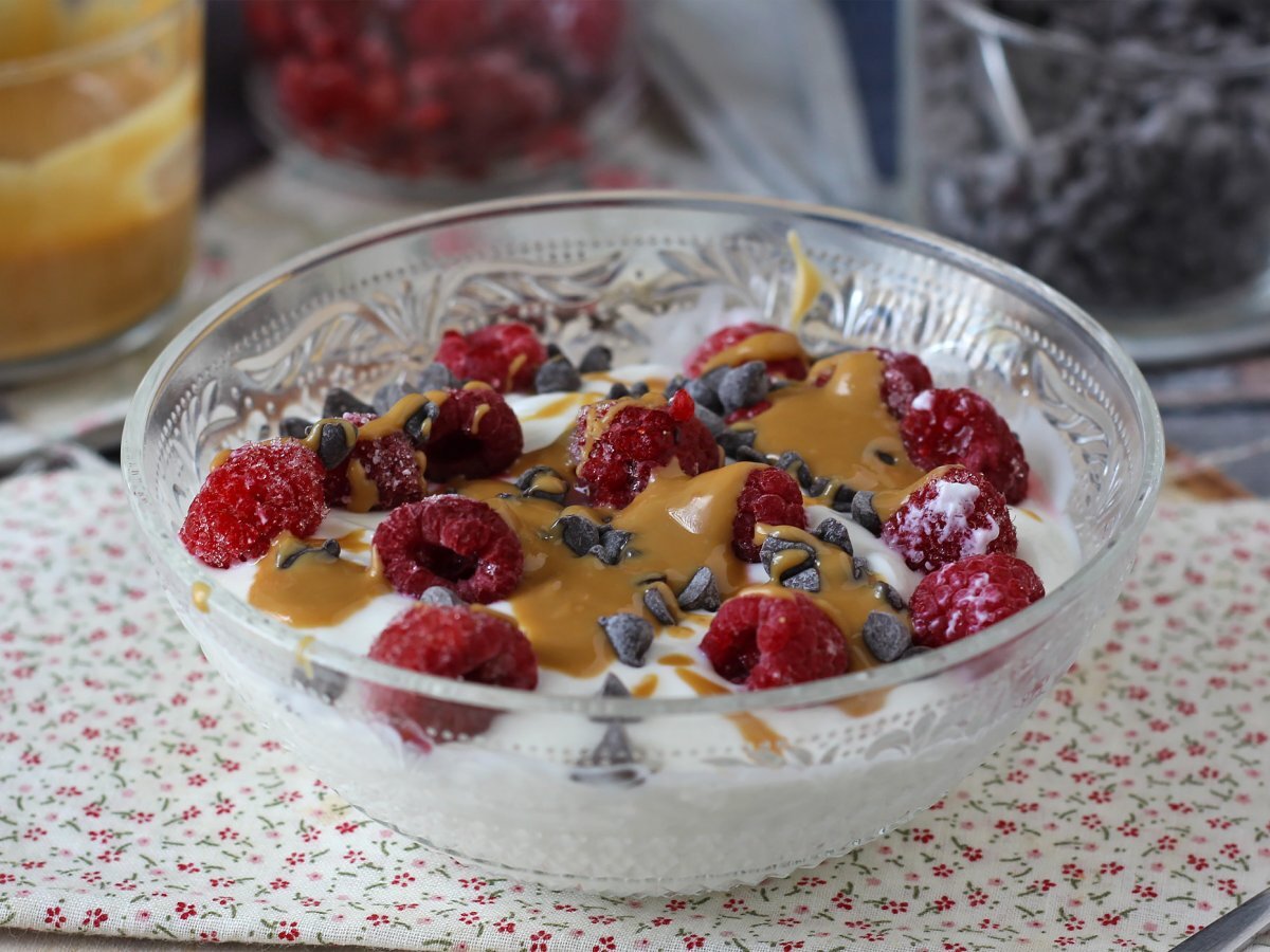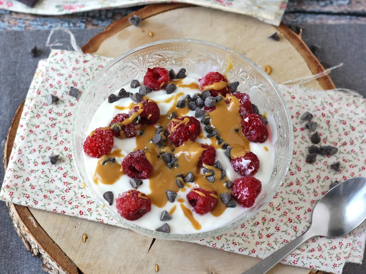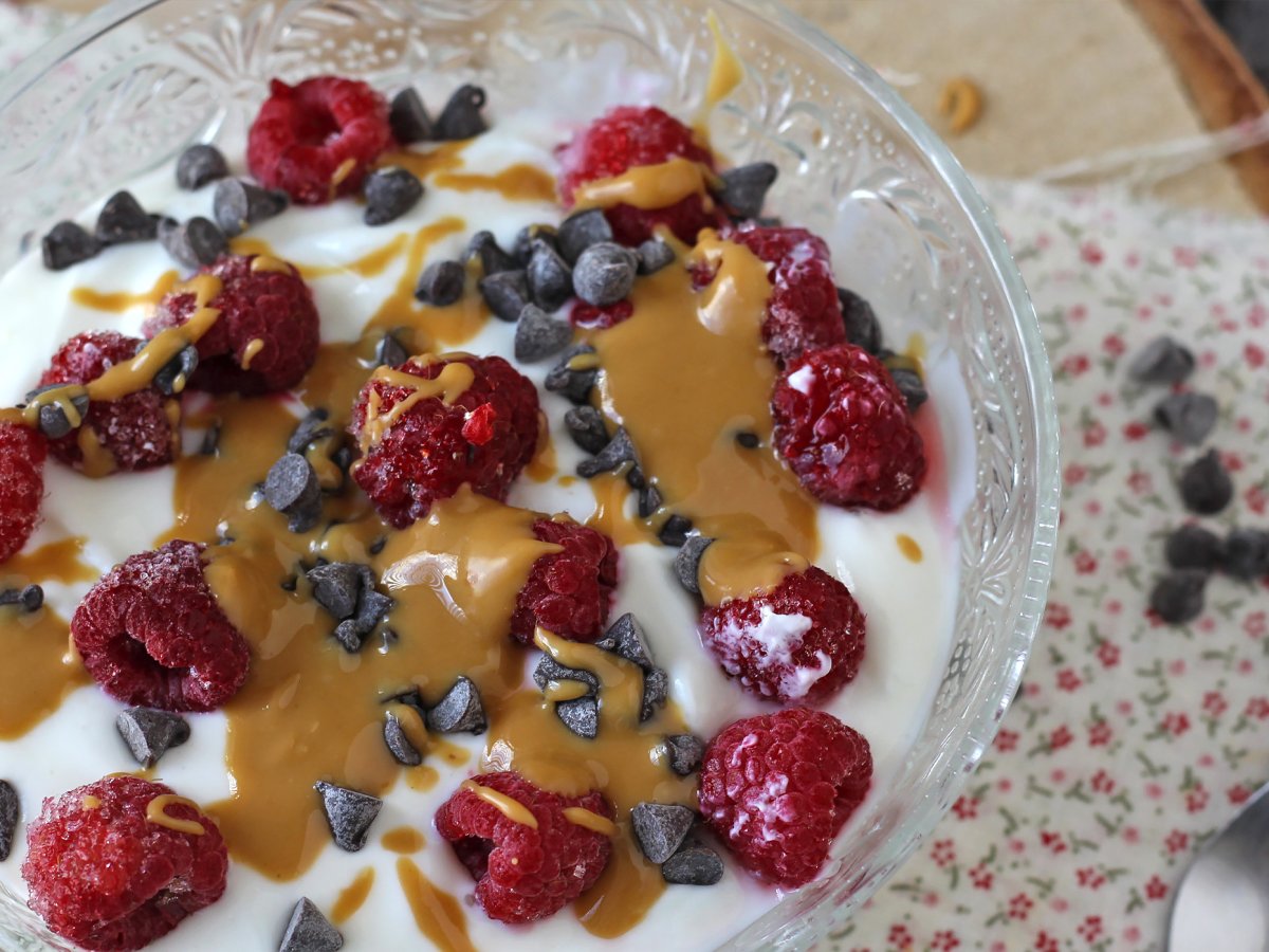 Bol skyr cu fructe roșii, unt de arahide și ciocolată