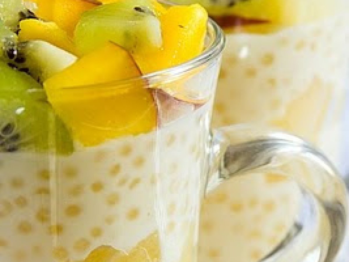 Budinca de tapioca PrecedentulUrmătorul DesertFoarte ușor15 min Trimite unui prieten Printează pagina Adresează o întrebare autorului Postează o poză cu rețeta gătită de tine Ingrediente 2 6 linguri perle tapioca 200 ml lapte de cocos 600 ml lapte 8 linguri zahar brut 4 felii subtiri de ghimbir 1/4 lingurita sare fructe: capsuni, ananas, kiwi, mango