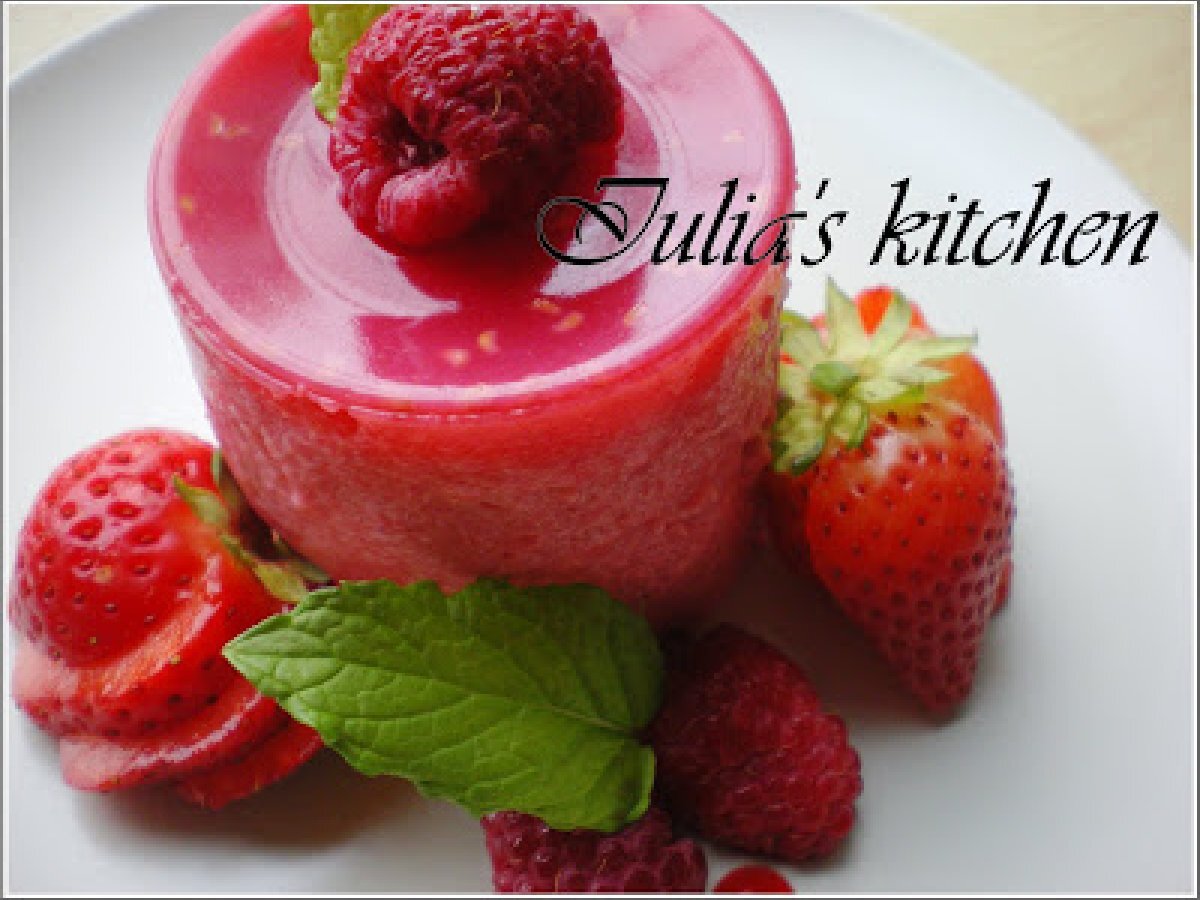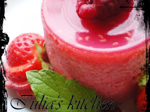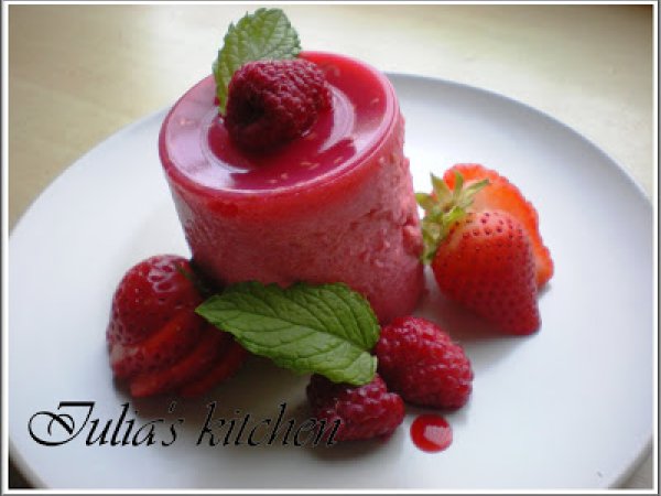 Budinca de zmeura votează acum PrecedentulUrmătorul DesertFoarte ușor15 min Trimite unui prieten Printează pagina Adresează o întrebare autorului Postează o poză cu rețeta gătită de tine Ingrediente 2 300 g zmeura 100 g capsune 300 ml frisca 250 ml suc de fructe de padure 50 g zahar pudra 30 ml miere 1 plic gelatina.