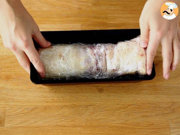 Taiati marginile ruloului de clatite la dimensiunea tavii de chec, apoi infasurati-l in folie de plastic. Puneti-l in tava si dati la rece timp de 3 ore.