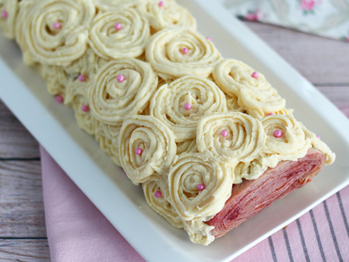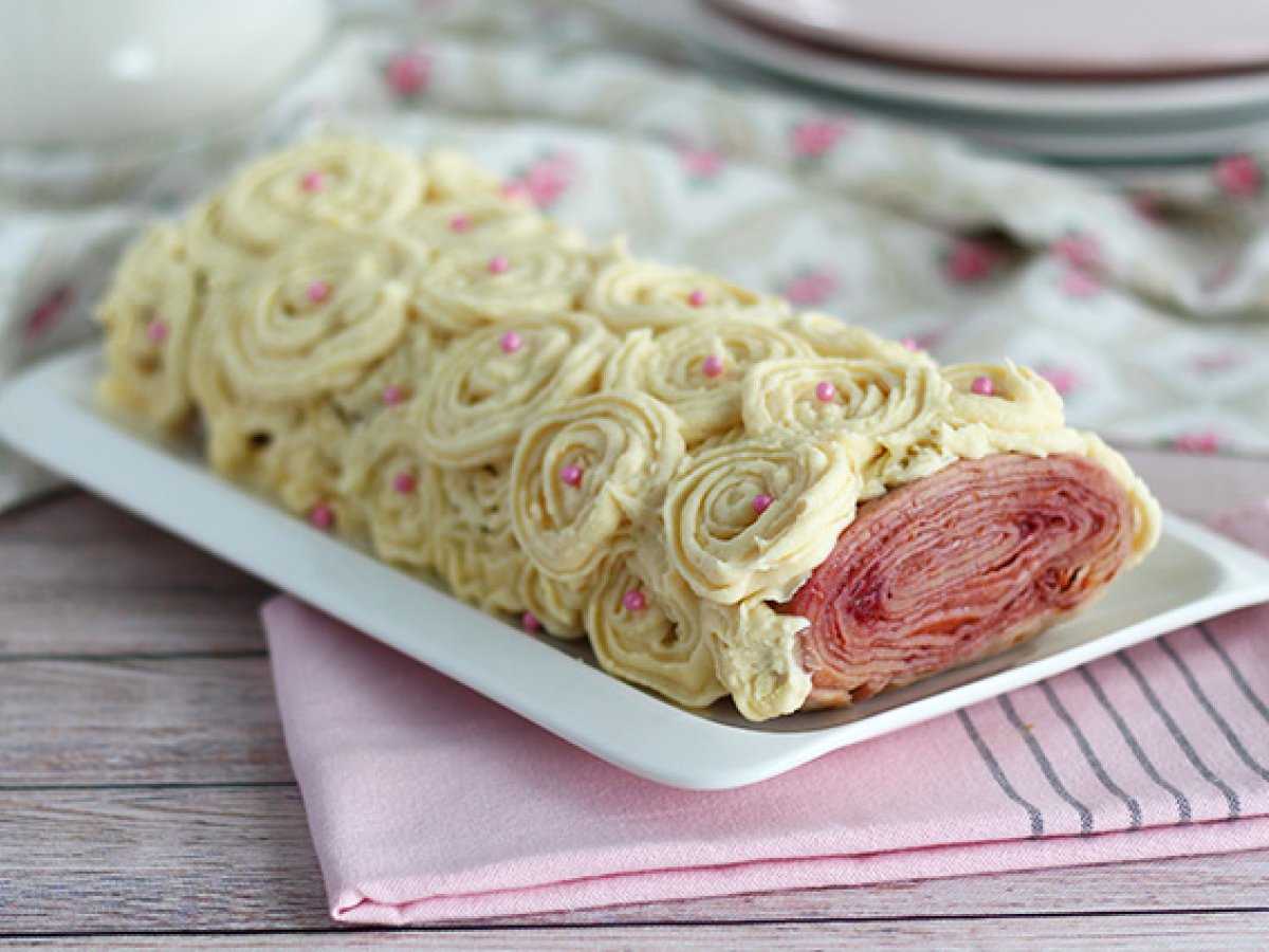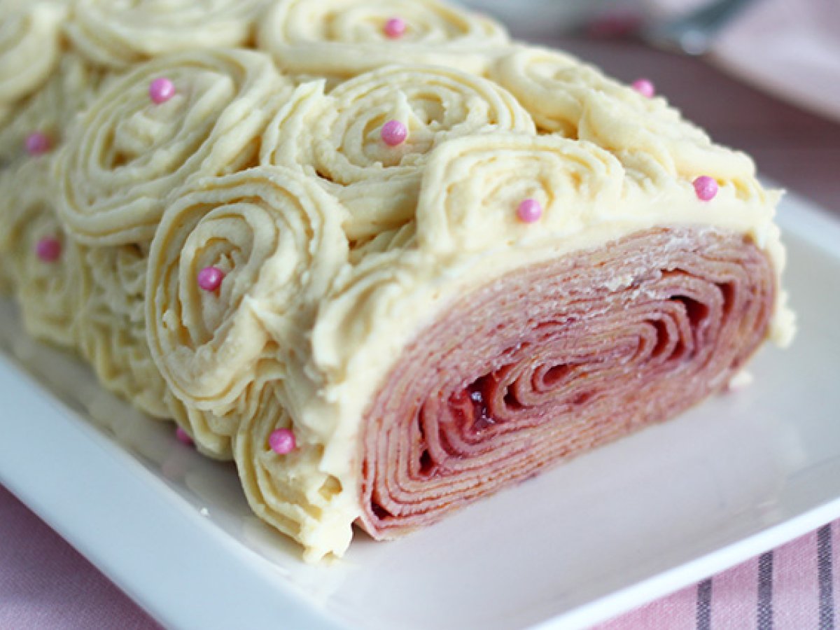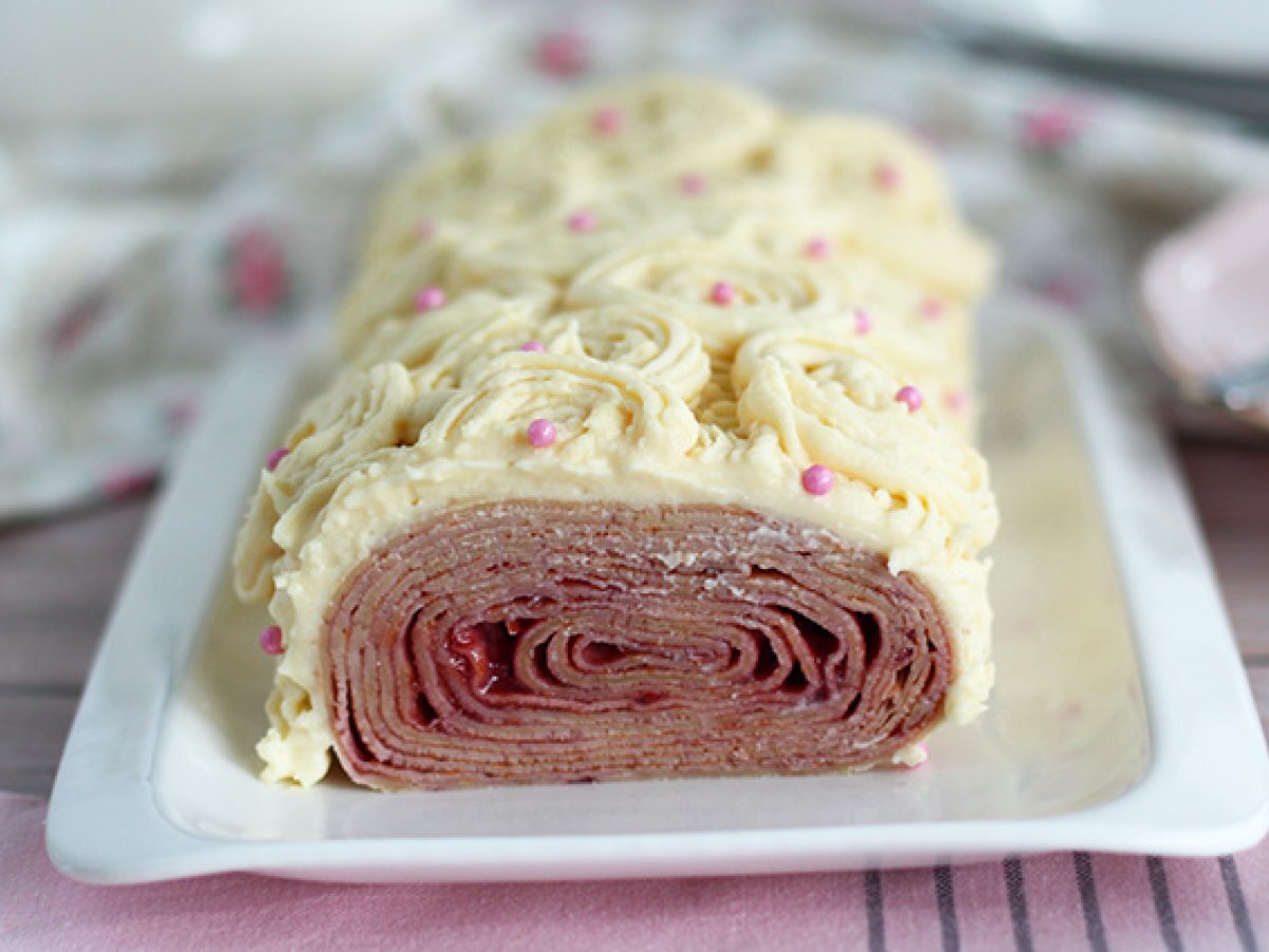 Scoateti ruloul de clatite si puneti-l pe un platou de servire. Folosind o punga de patiserie, decorati cu ganacheul de ciocolata alba facut anterior. Finisati decorul cu perle de zahar roz.