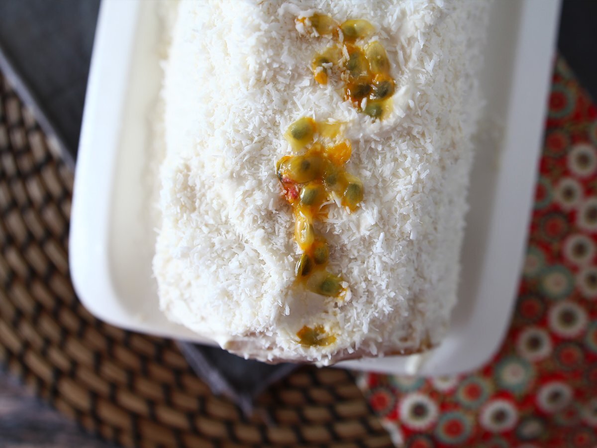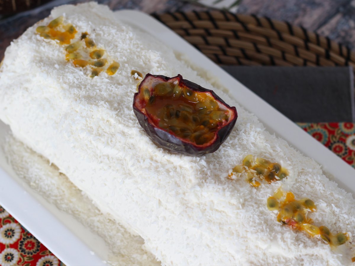 Acoperiți rulada cu cremă și presărați nucă de cocos rasă. Adăugați puțină pulpă de fructul pasiunii deasupra și decorați cu jumătate de fructul pasiunii.