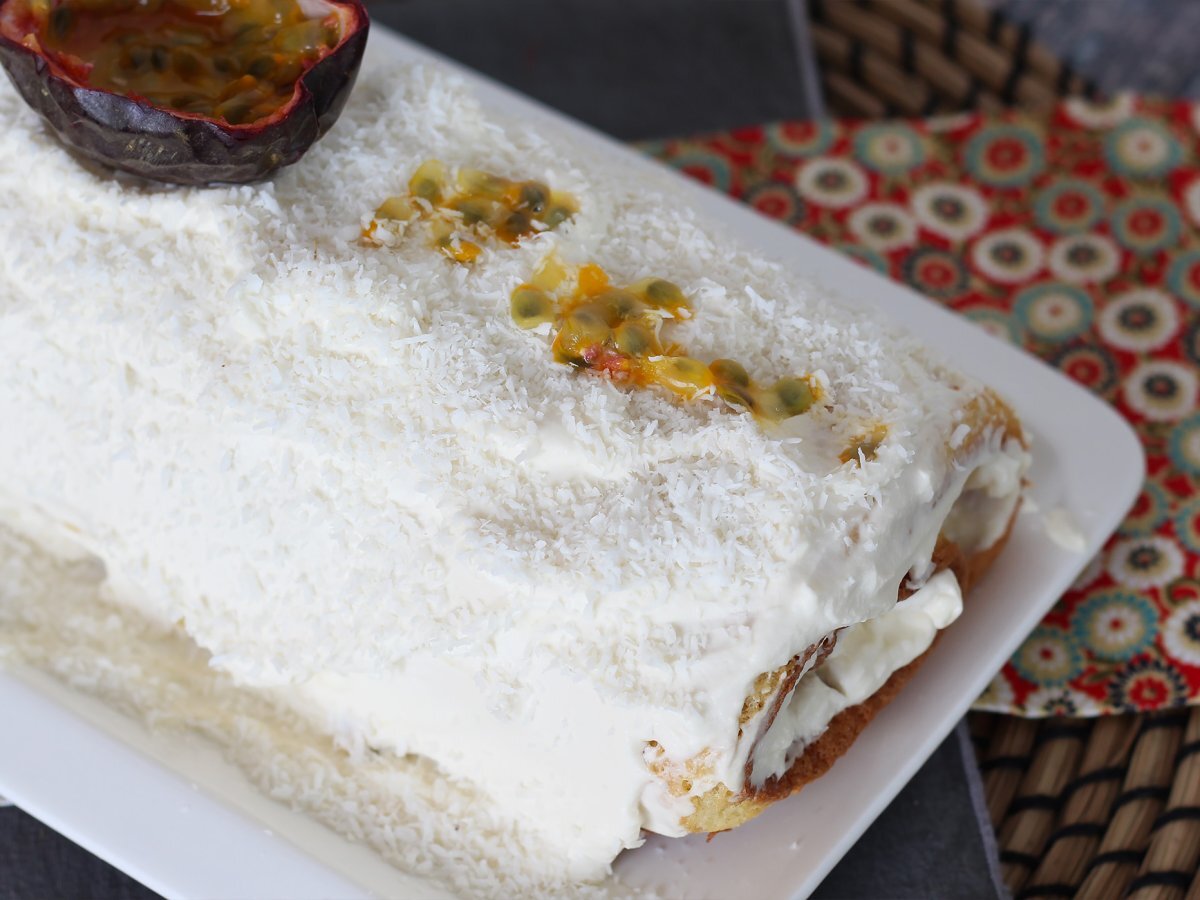 Ingredientele principale includ albușuri, gălbenușuri, zahăr, făină, nucă de cocos, smântână, mascarpone și fructul pasiunii.