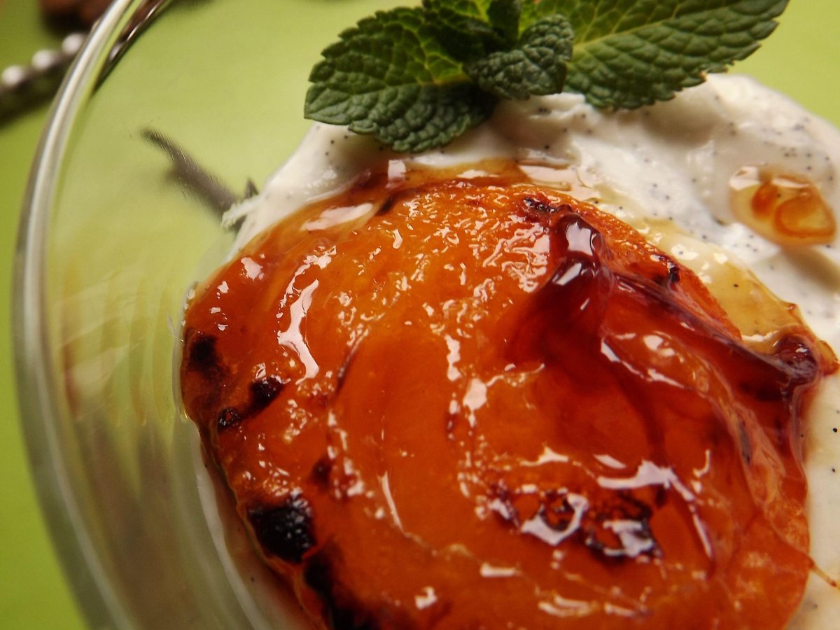 Caise caramelizate servite cu crema de mascarpone, vanilie si miere PrecedentulUrmătorul DesertFoarte ușor15 min Trimite unui prieten Printează pagina Adresează o întrebare autorului Postează o poză cu rețeta gătită de tine Ingrediente 2 patru caise patru linguri de zahar brun 40 grame unt patru lingurite de miere 100 grame mascarpone o pastaie de vainilie de bourbon cateva frunzulite de menta proaspata