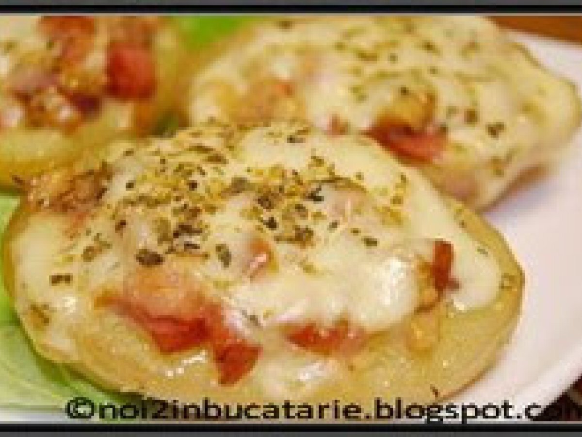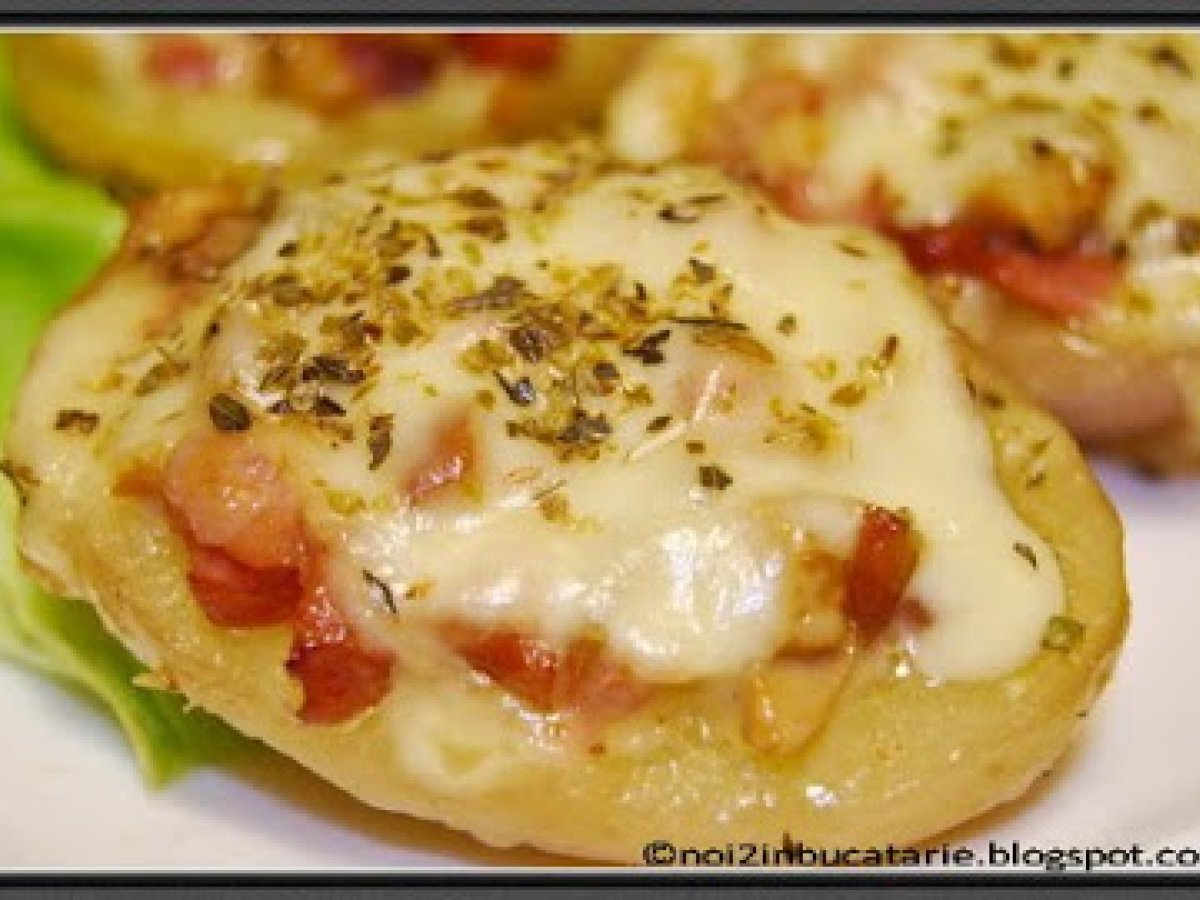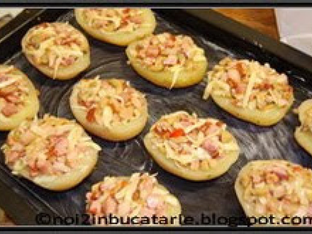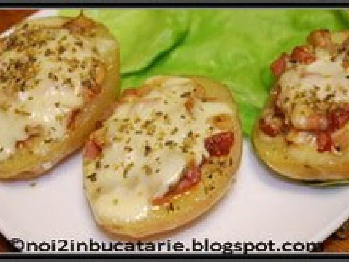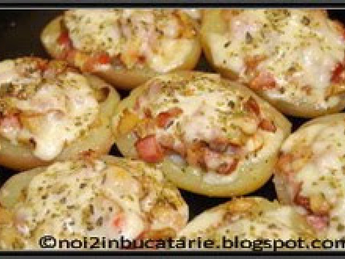Cartofi umpluti PrecedentulUrmătorul DesertFoarte ușor45 min Trimite unui prieten Printează pagina Adresează o întrebare autorului Postează o poză cu rețeta gătită de tine Ingrediente 4 6 cartofi potrivit de mari si aproximativ de aceeasi marime, fierti in coaja o ceapa jumatate de ardei 200 g kaizer sau bacon (sau ceva sunculita, dar mai grasa) 200 g sunculita taraneasca (fara asa multa grasime) 100 g cascaval o conserva mica de ciuperci 125 g mozzarella
