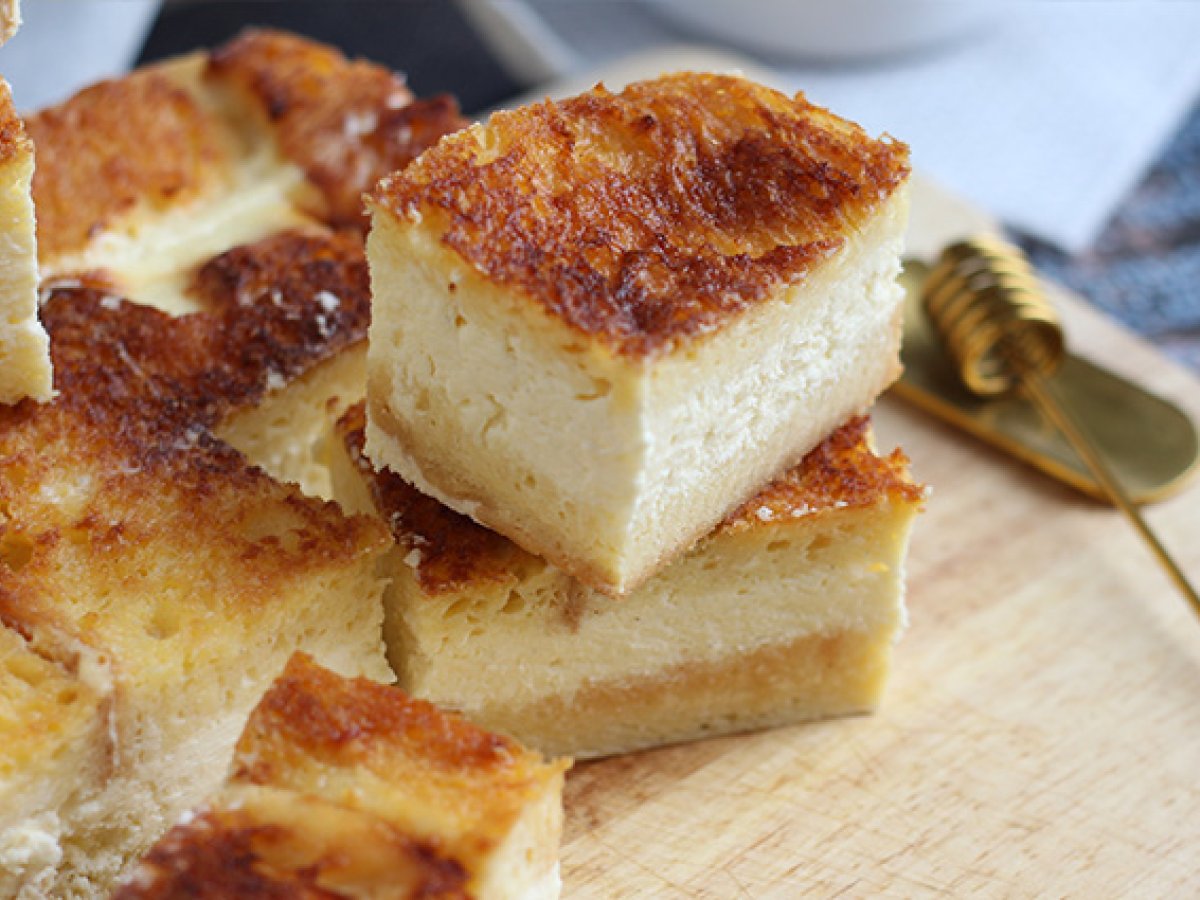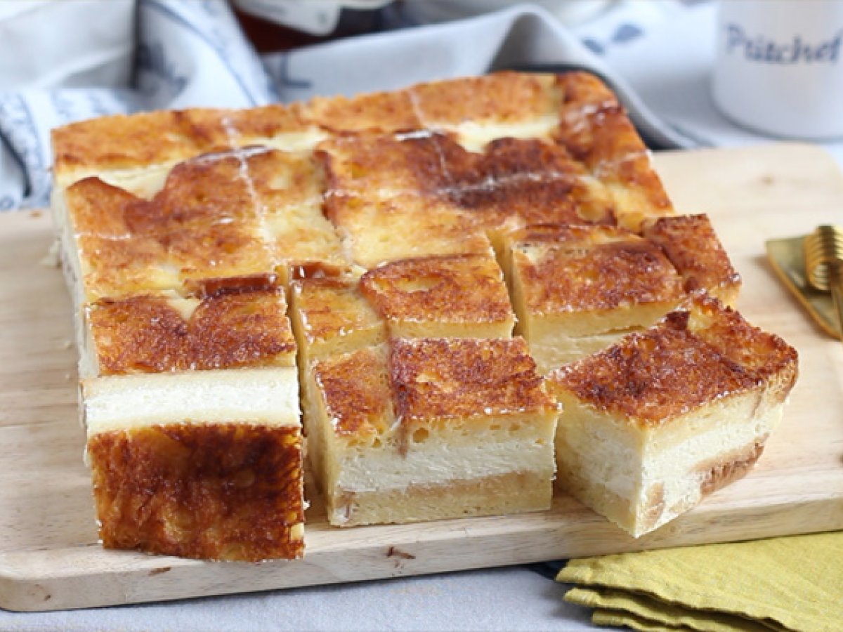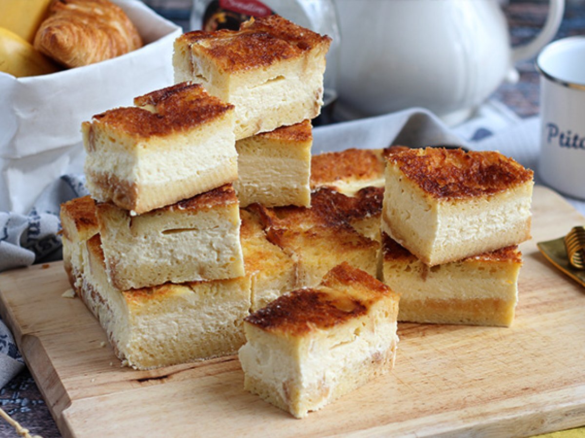 In cele din urma, acoperiti stratul de cheesecake cu briose inmuiate. Introduceti in cuptorul preincalzit la 140° C timp de 1 h si 5 minute.
