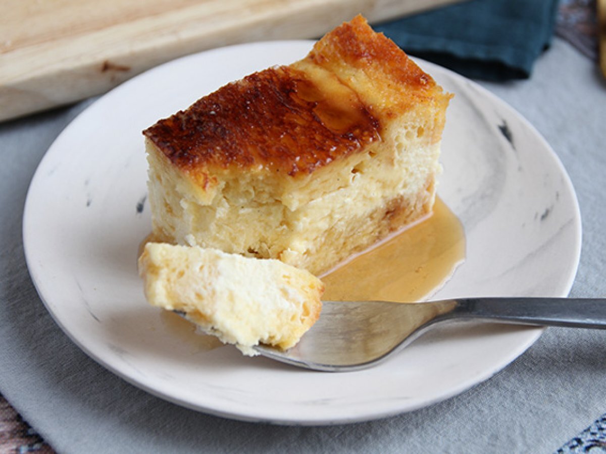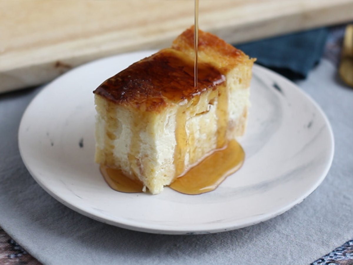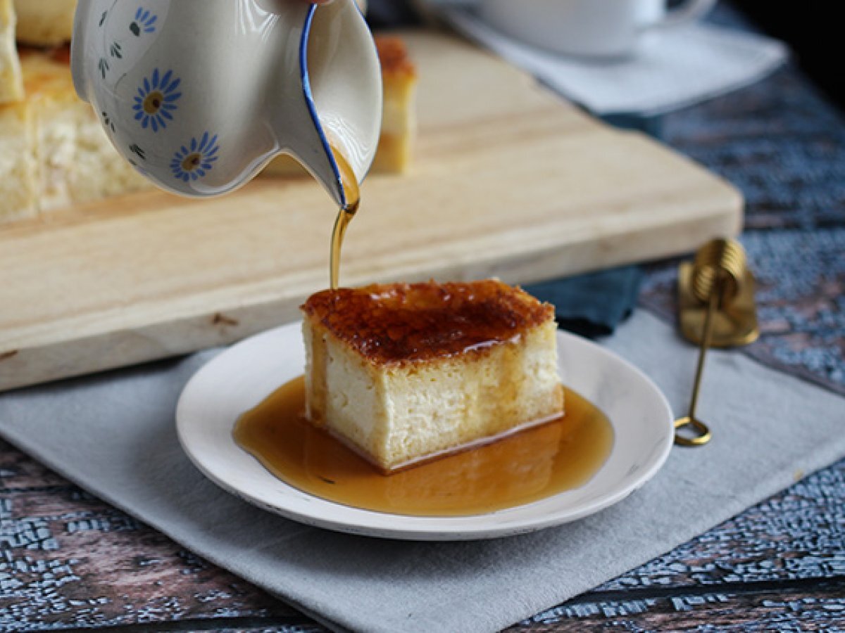 In cele din urma, acoperiti stratul de cheesecake cu briose inmuiate. Introduceti in cuptorul preincalzit la 140° C timp de 1 h si 5 minute.