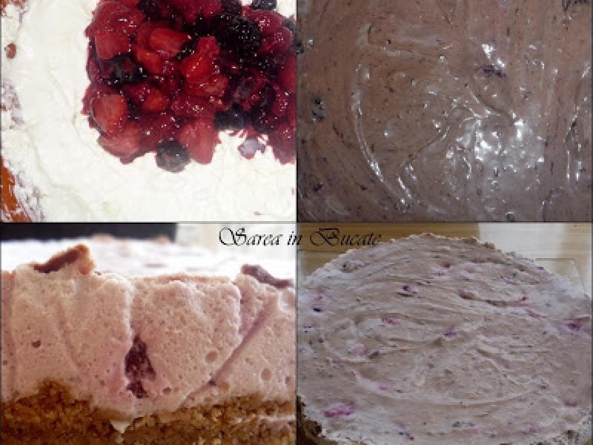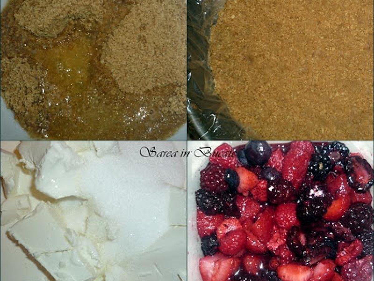 Cheesecake cu fructe de padure si ciocolata votează acum PrecedentulUrmătorul DesertFoarte ușor1 oră Trimite unui prieten Printează pagina Adresează o întrebare autorului Postează o poză cu rețeta gătită de tine Ingrediente 4 pentru crusta(baza): 180 g biscuiti digestivi 75 g unt pentru crema: 100 g ciocolata cu lapte 300 g crema de branza 200 ml frisca lichida 75 g zahar 150 g fructe de padure ciocolata topita pentru decor(optional) 1 plic de gelatina