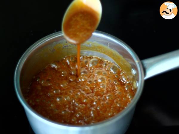 Când amestecul fierbe, amestecați aproximativ 10 minute pentru a îngroșa caramelul.Dați deoparte.