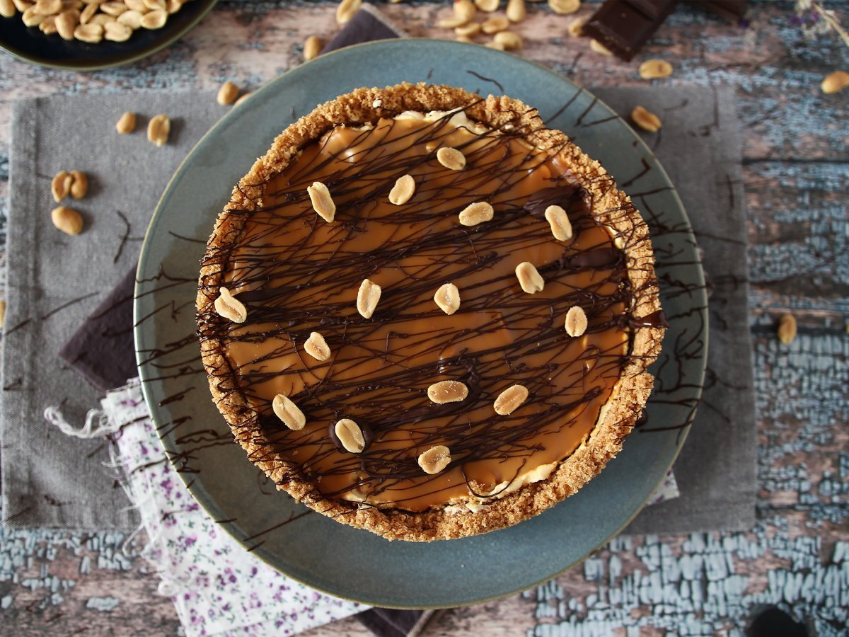 Se toarnă amestecul în formă, la bază. Acoperiți blatul cu arahide (păstrați câteva pentru mai târziu ↓). Deasupra se toarnă caramelul cu unt sărat și se dă la frigider pentru cel puțin 4 ore, cel mai bine peste noapte.