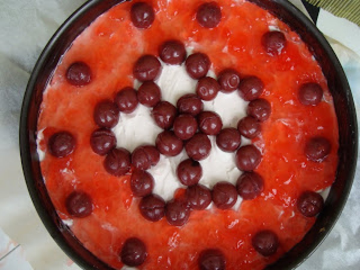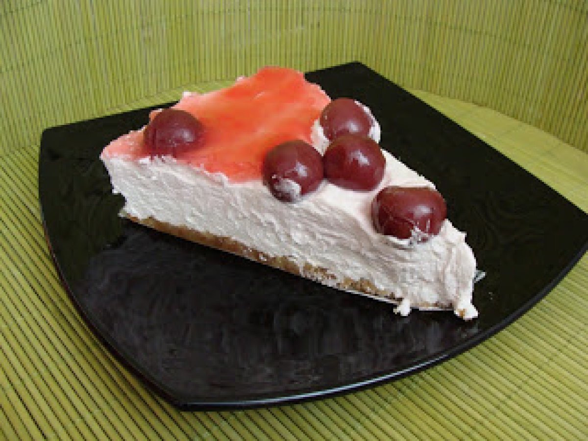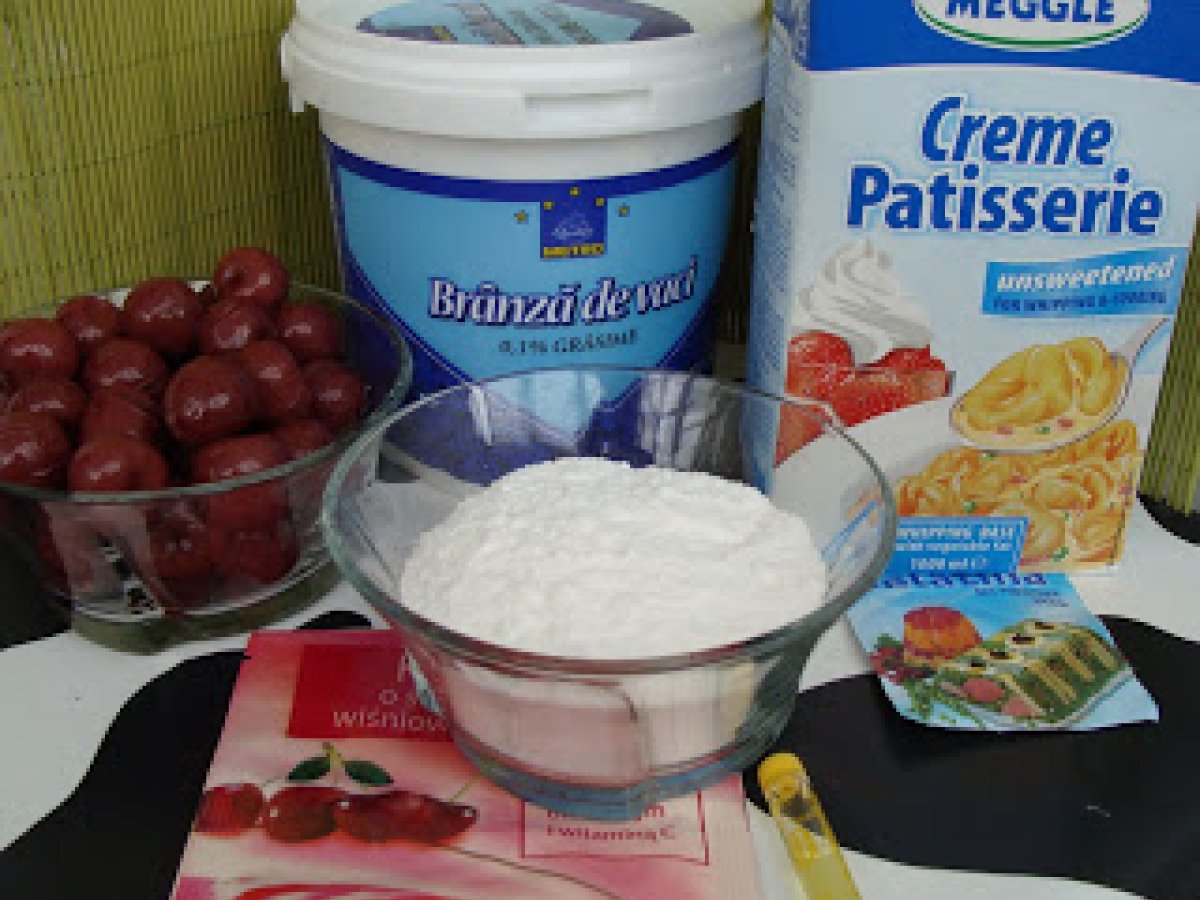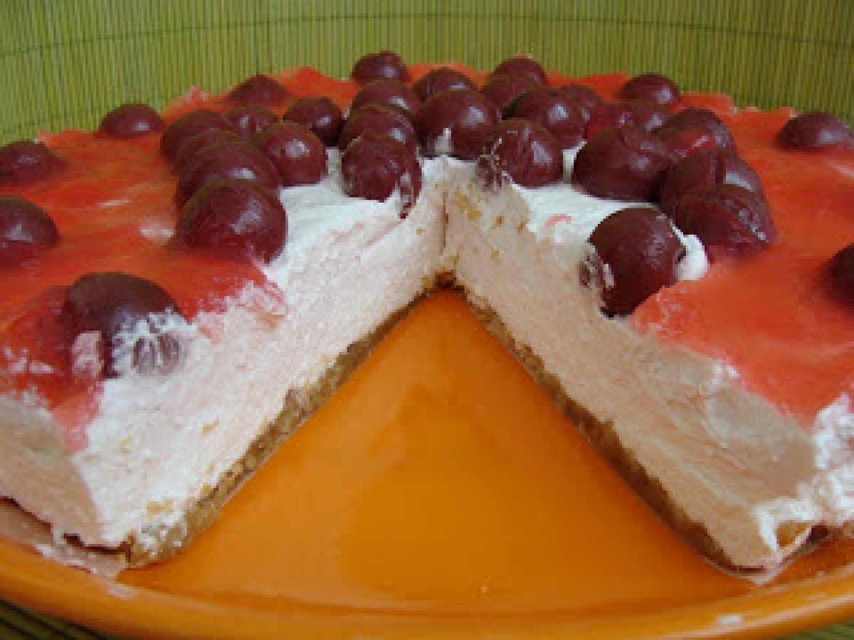 Cheesecake cu visine PrecedentulUrmătorul DesertFoarte ușor1 h 25 m Trimite unui prieten Printează pagina Adresează o întrebare autorului Postează o poză cu rețeta gătită de tine Ingrediente 6 250 g biscuiti simpli sau aromati 150 g unt topit 100 g zahar 500 g branza de vaci degresata sau crema de branza 200 g zahar pudra 250 ml frisca lichida 1 fiola esenta vanilie 2-3 lingurite lichior Angelli ( facultativ) 1 plic gelatina 1 compot de visine 1 plic jeleu de fructe (visine)