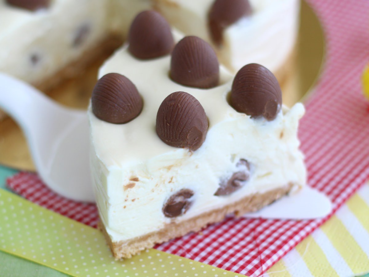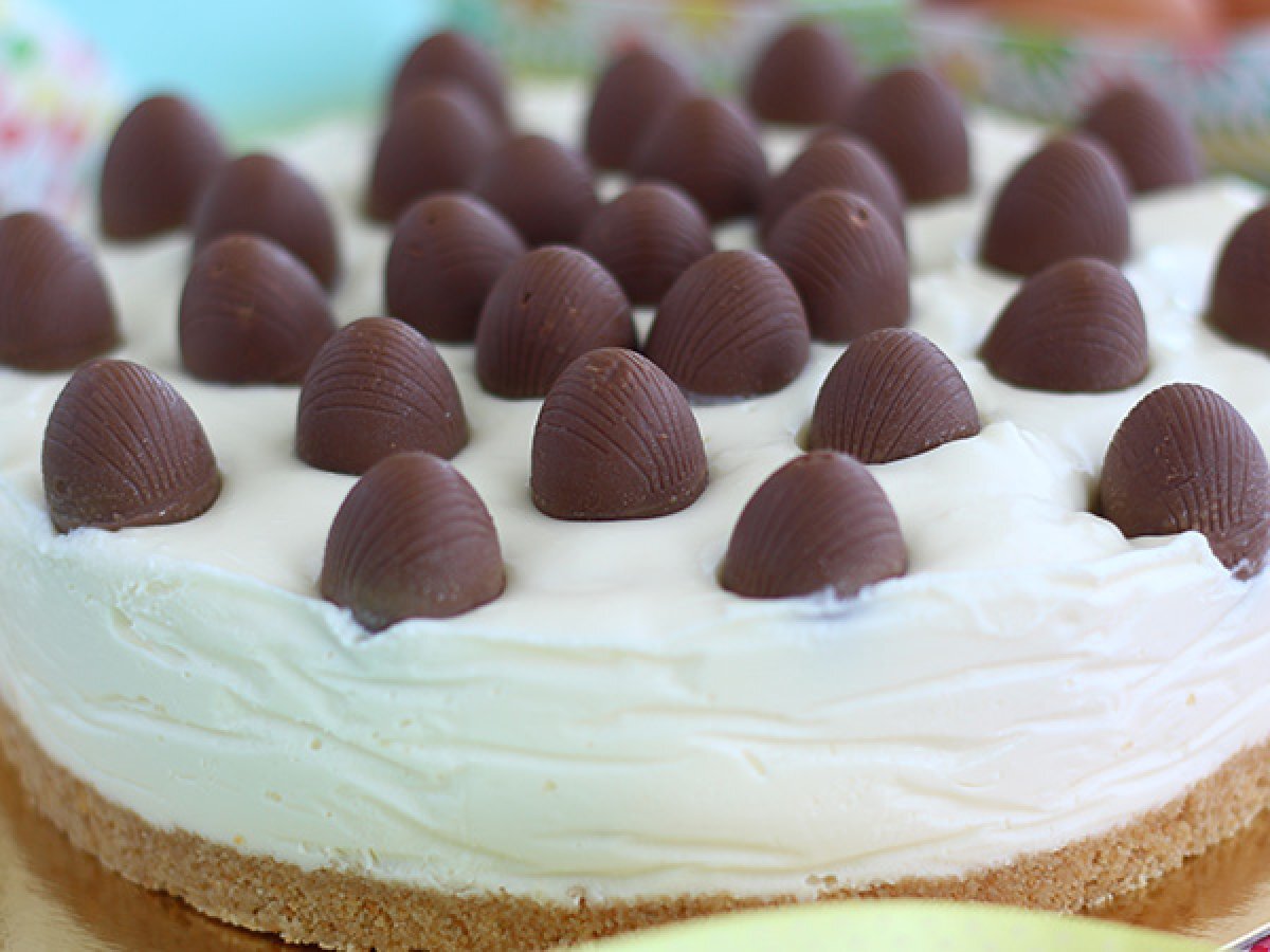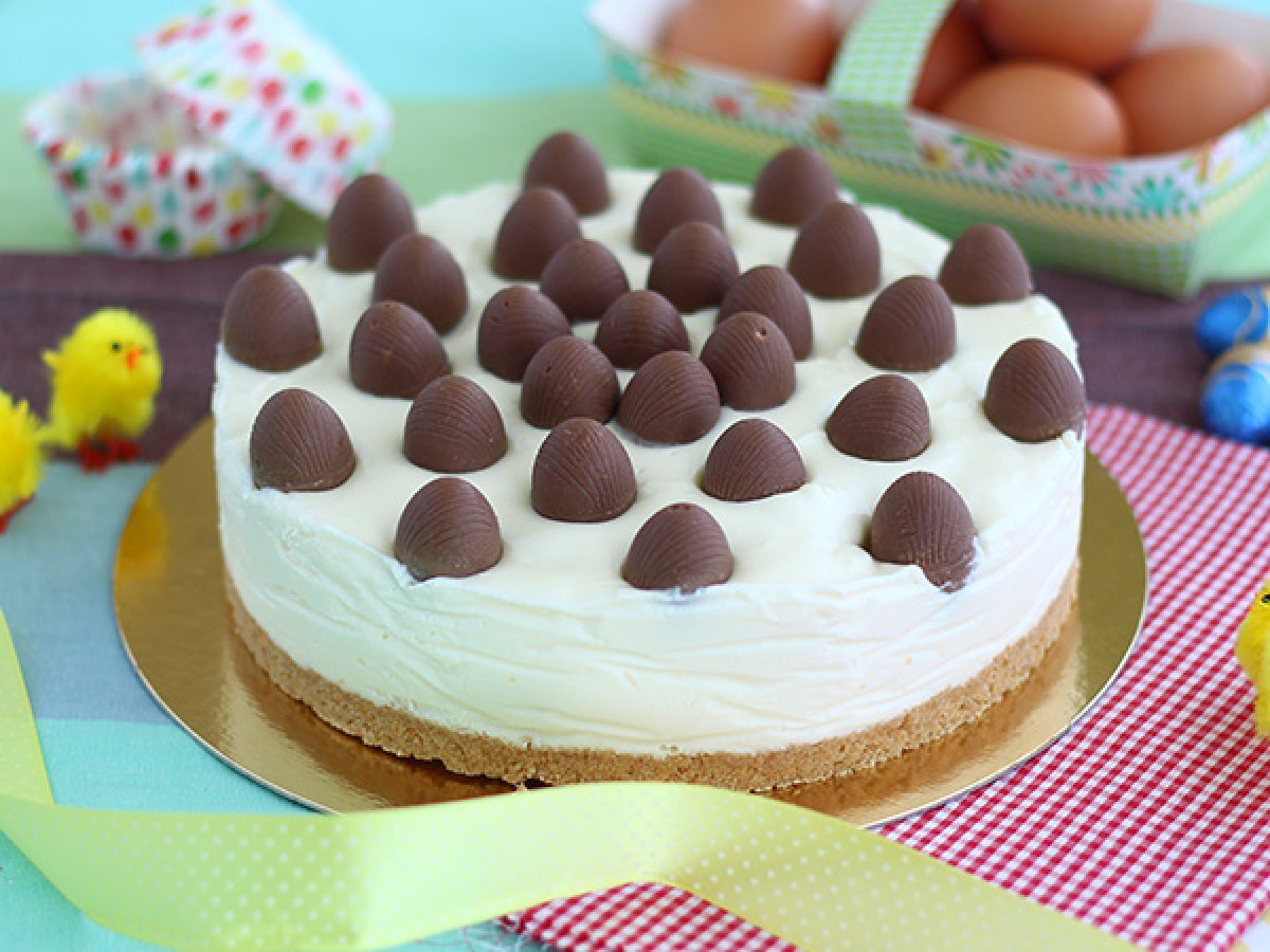 Puneti oua de ciocolata pentru a decora, apasandu-le usor in crema.Raciti cel putin 4 ore.