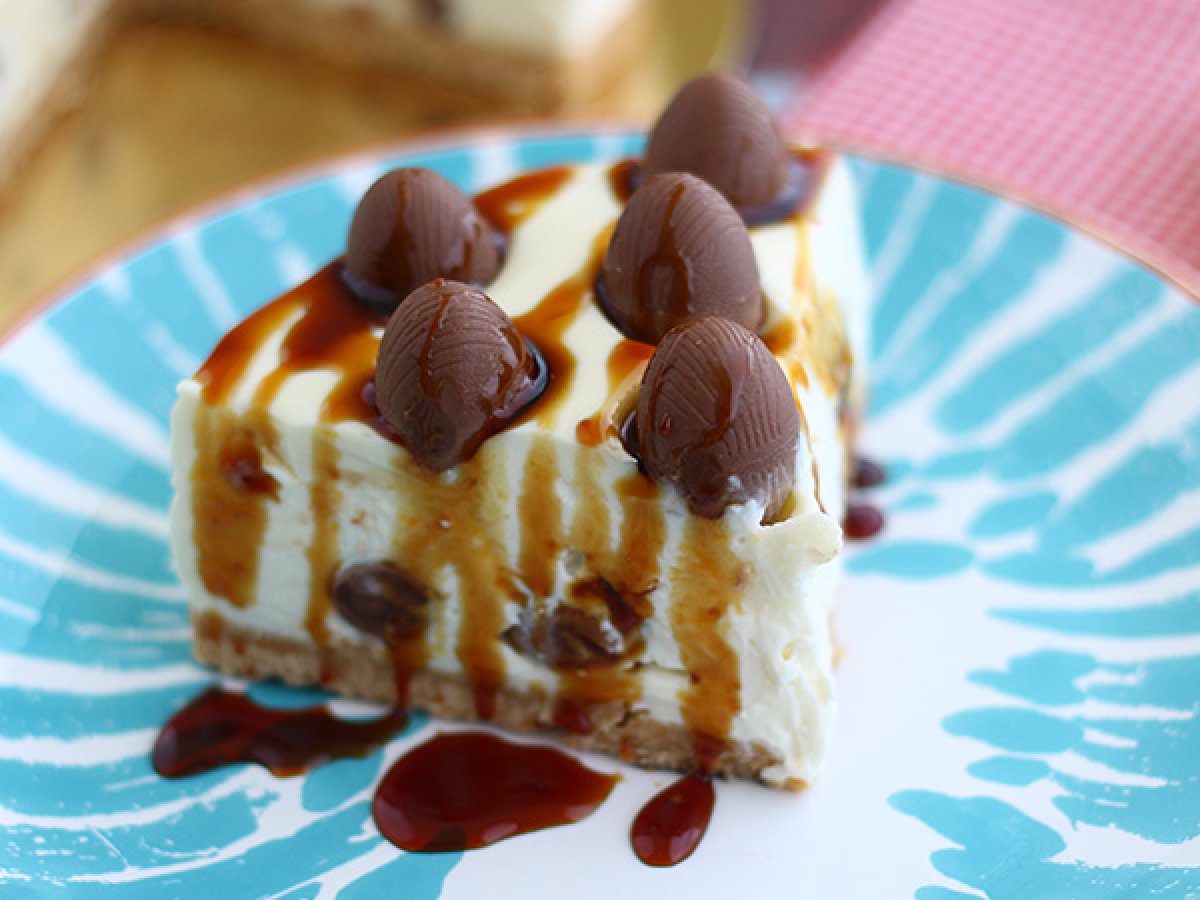 Dupa tipul de racire, desfaceti usor si indepartati benzile de hartie pergament. Turnati caramel pe feliile de cheesecake la momentul servirii si bucurati-va de acest superb desert de Paște!