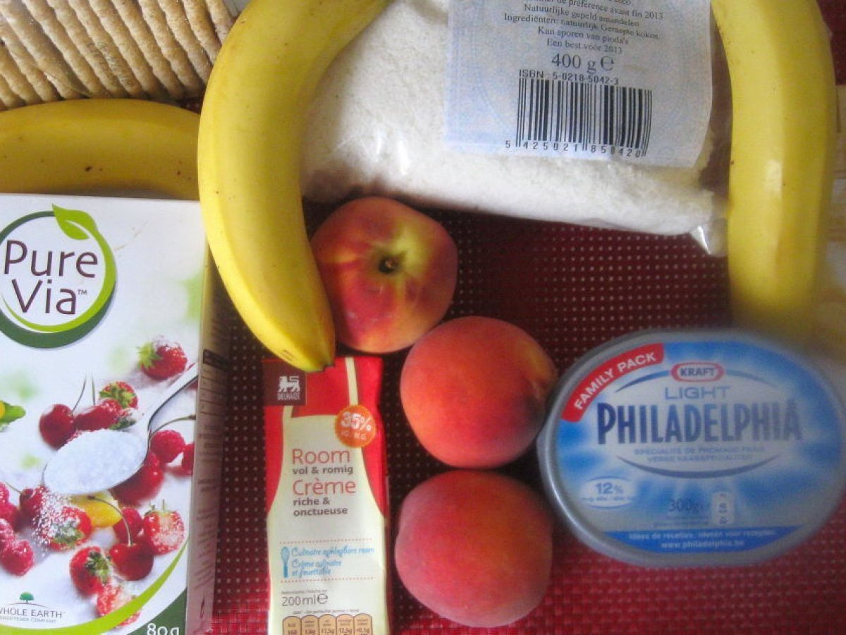 Cheesecake light cu banane, piersici si zmeura PrecedentulUrmătorul DesertUșor45 min Trimite unui prieten Printează pagina Adresează o întrebare autorului Postează o poză cu rețeta gătită de tine Ingrediente 8 ? 300 g biscuiti digestivi ? 150 g unt light ? 400 g branza « Philadelphia » light ? 200 g frisca lichida light ? 4-5 linguri « stevia » pudra sau 200-250 g zahar ? 4-5 piersici sau piersici din compot ? 250 g zmeura proaspata sau congelata ? 1-2 banane ? sucul de la o lamaie ? cateva frunze de menta verde ? 100 g ciocolata alba light ? 3-4 linguri nuca de cocos ? 2 pliculete agar-agar sau gelatina (unul de gelatina pentru tarta) ? esenta de vanilie sau zahar vanilat (dupa dorinta)