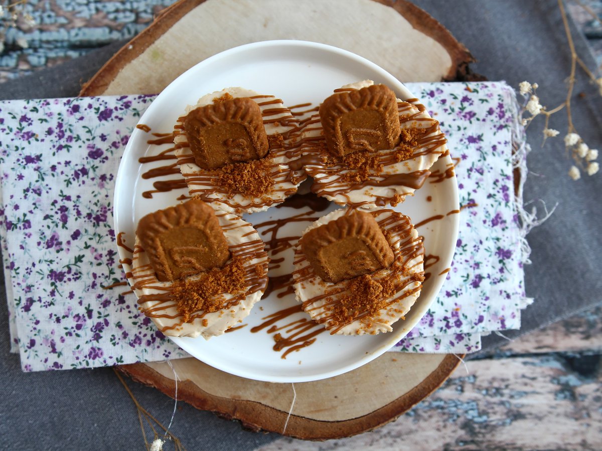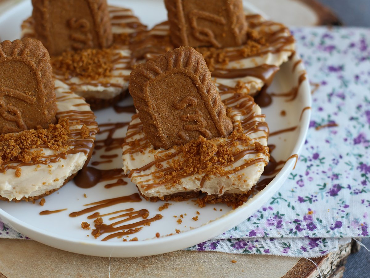 Presărați pesmet de speculoos deasupra și puneți o jumătate de speculoos în cheesecake. Gata, cheesecake-urile dvs.sunt gata de devorat!