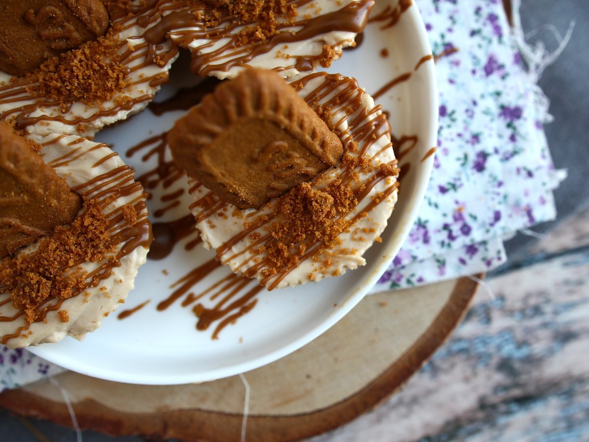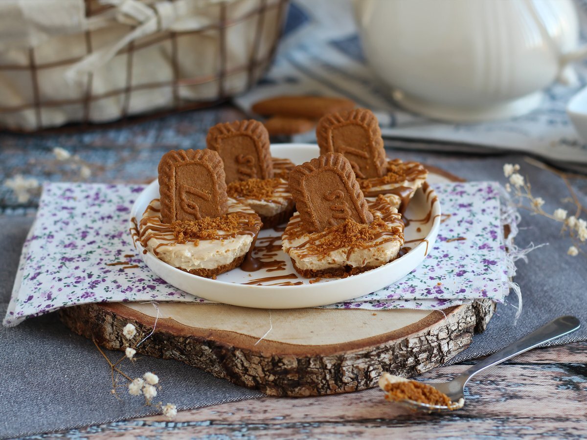 Poți topi pasta de speculoos și o poți turna deasupra cheesecake-urilor, apoi presară pesmet de speculoos și adaugă jumătăți de biscuiți pentru un decor delicios.