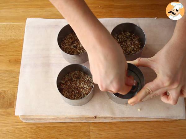 Puneti amestecul in partea de jos a fiecărui cerc pentru cheesecake si presati bine.
