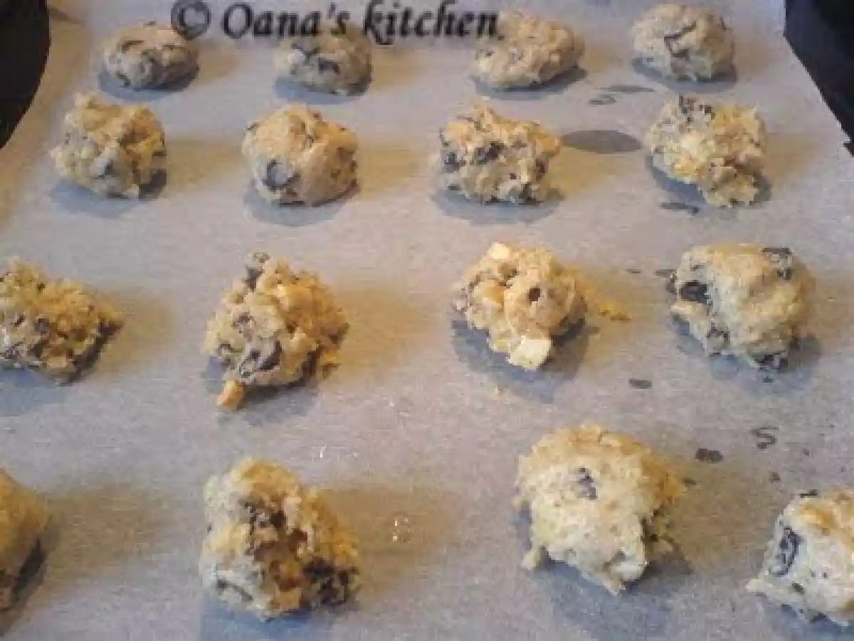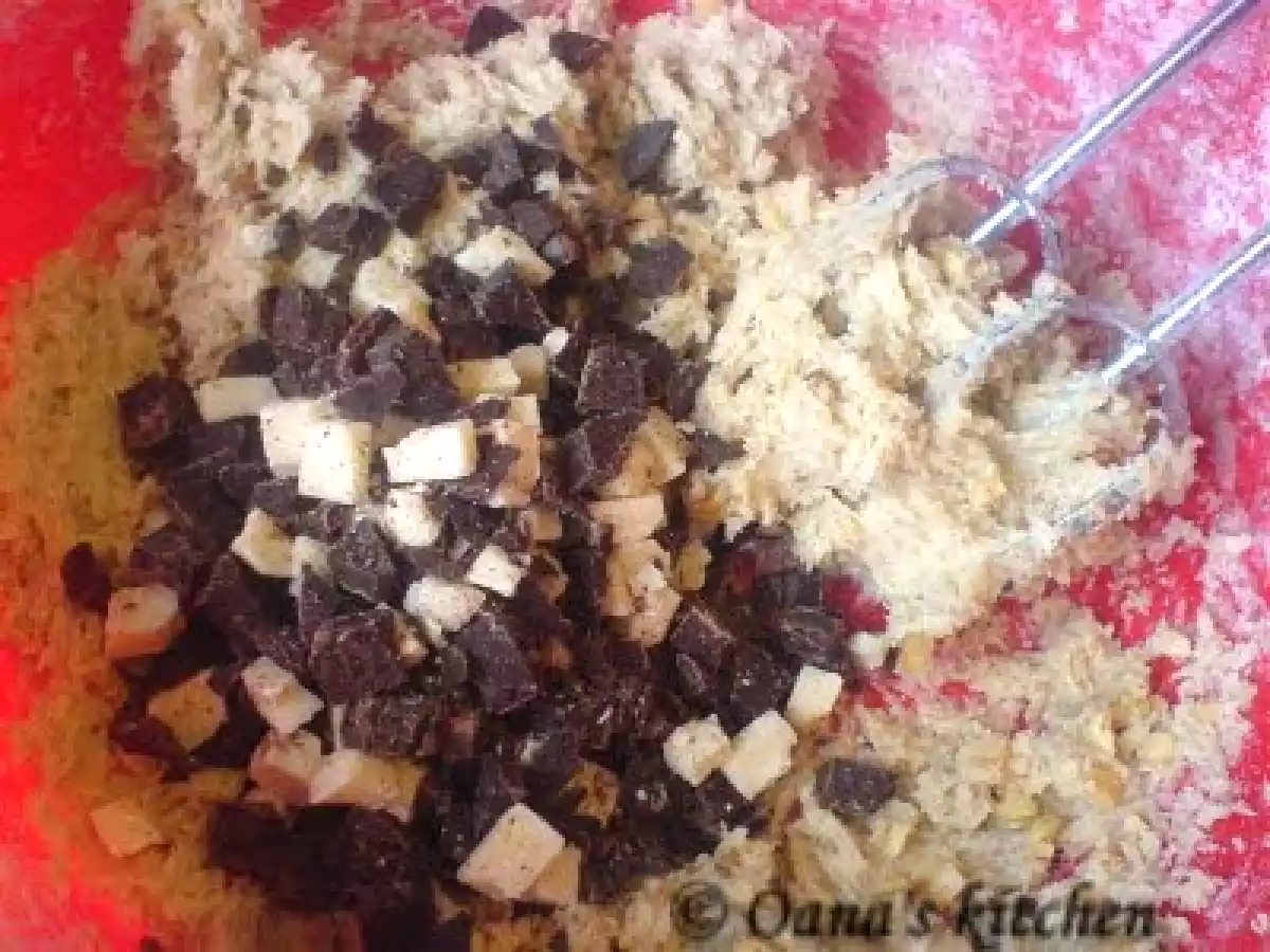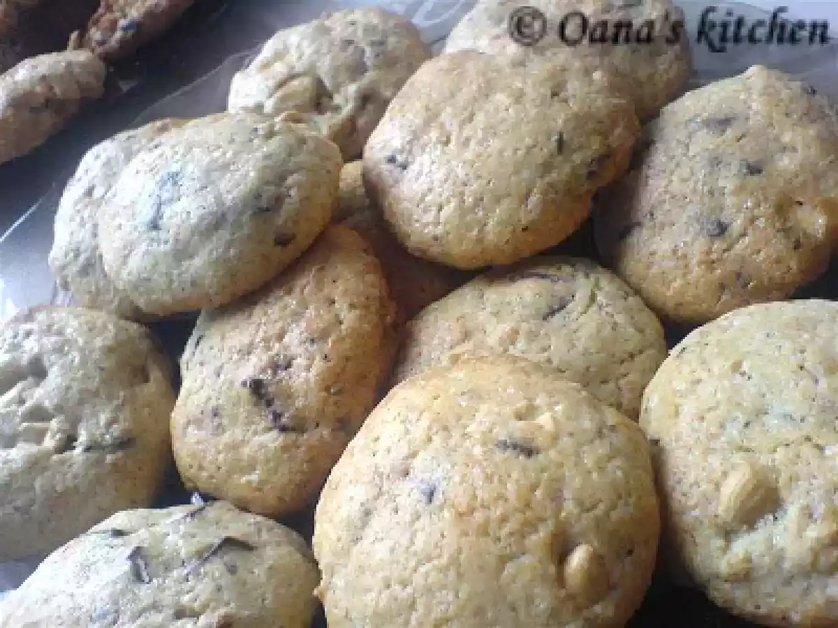Chocolate chip cookies ( biscuiti cu bucati de ciocolata, nuci si alune) PrecedentulUrmătorul DesertFoarte ușor45 min Trimite unui prieten Printează pagina Adresează o întrebare autorului Postează o poză cu rețeta gătită de tine Ingrediente 4 120 g unt 80 g zahar 1 ou esenta de vanilie 1oo g faina alba 150 g faina neagra 1 praf de copt 50 g nuci 50 g alune 200 g ciocolata alba+ neagra