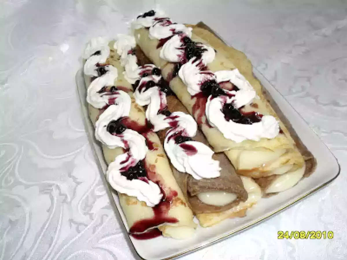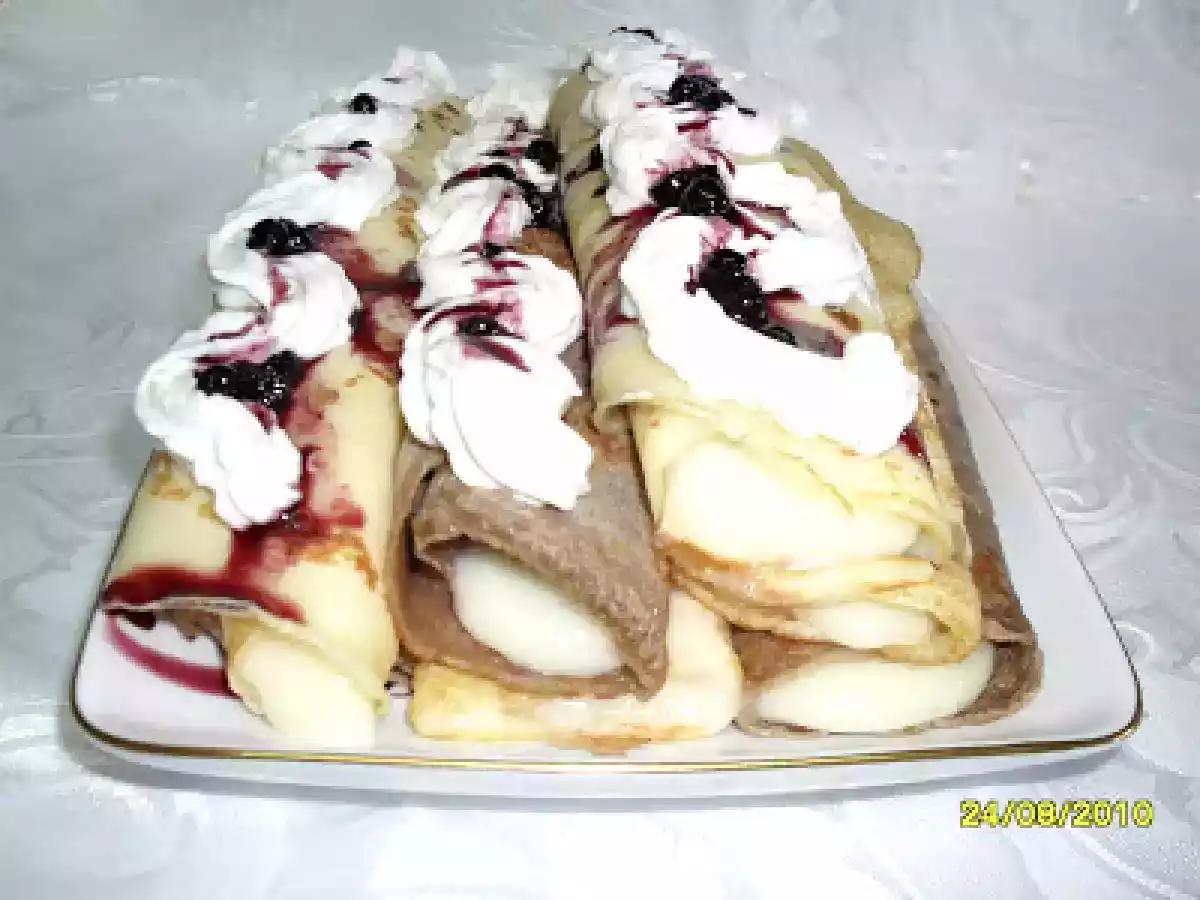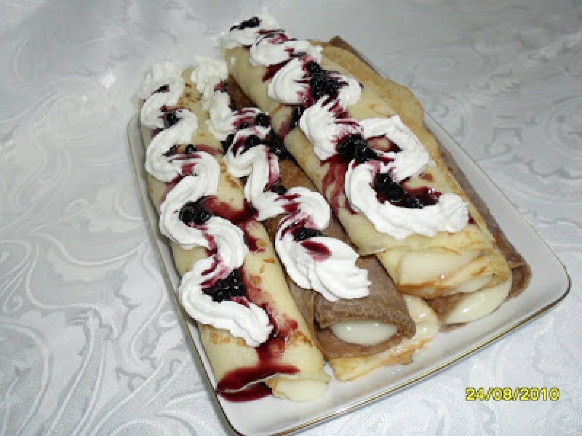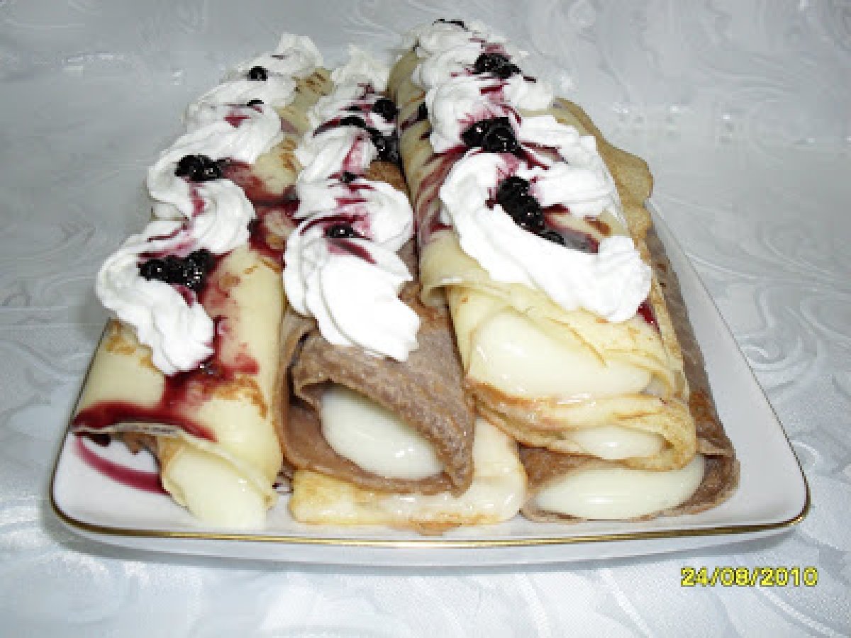 Clatite cu budinca de vanilie si frisca PrecedentulUrmătorul DesertFoarte ușor50 min Trimite unui prieten Printează pagina Adresează o întrebare autorului Postează o poză cu rețeta gătită de tine Ingrediente 6 CLATITE: 1 l lapte 3 oua 600-700 g. faina 1 lingura zahar esenta de vanilie 1 praf de sare 1 ceasca apa minerala CREMA 1 plic budinca de vanilie 500 ml lapte 6 linguri zahar DECOR: 1 plic praf de frisca 200 ml lapte dulceata de afine