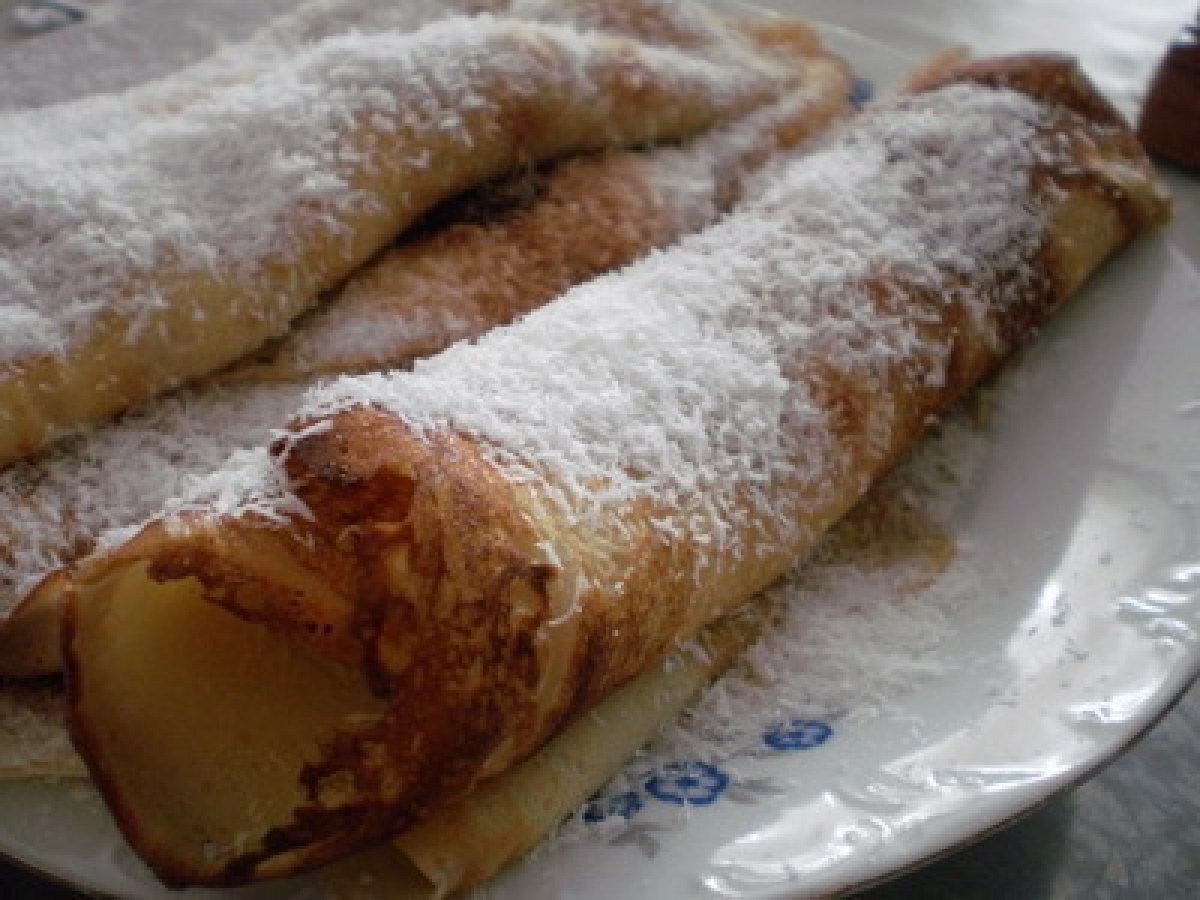 Clatite cu dulceata si nuca de cocos DesertUșor30 min Trimite unui prieten Printează pagina Adresează o întrebare autorului Postează o poză cu rețeta gătită de tine Ingrediente 8 putina dulceata (de prune facuta in casa fara conservanti) putina nuca de cocos data pe razatoare (uscata) 1 litru de lapte degresat fara grasimi sau cu 1% grasimi circa 300 de grame de faina integrala putin ulei vegetal si 2 oua de gaina.