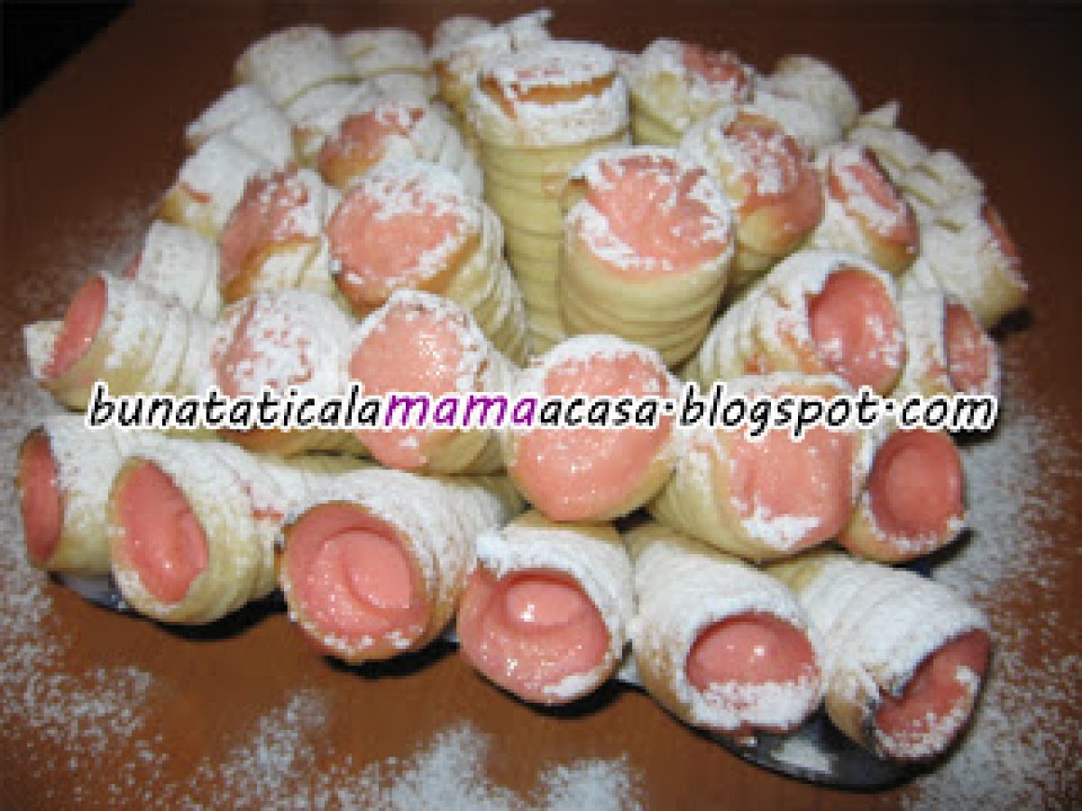 Cornete PrecedentulUrmătorul DesertFoarte ușor35 min Trimite unui prieten Printează pagina Adresează o întrebare autorului Postează o poză cu rețeta gătită de tine Ingrediente 6 2 oua 10 linguri zahar 10 linguri ulei 13 linguri apa 1 1/2 lingurita amoniu pentru prajituri esenta de vanilie faina cat cuprinde crema: 1 plic praf de budinca de capsuni sau zmeura 300 ml lapte 200 g margarina 4-5 linguri de zahar