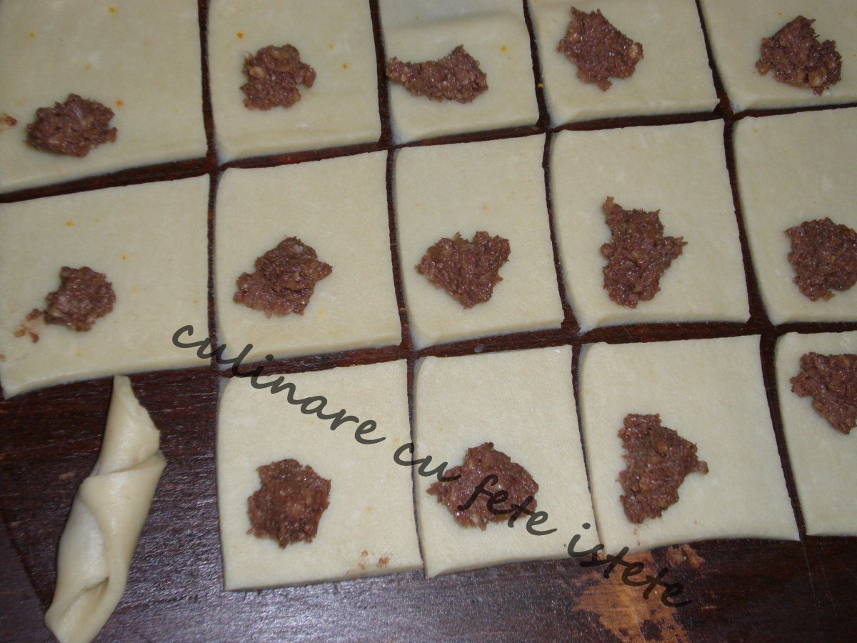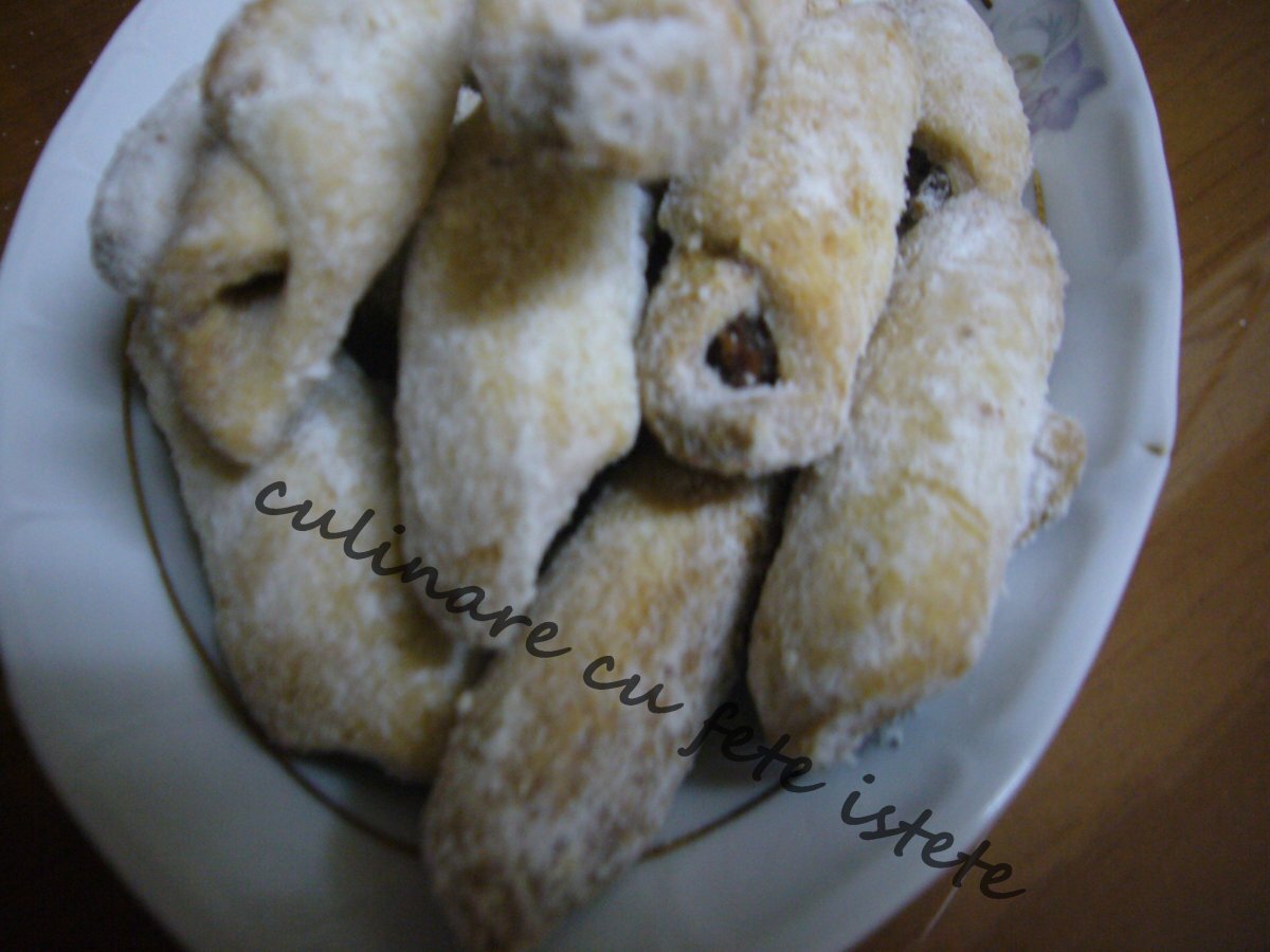 Cornulete fragede cu nuca(rahat) PrecedentulUrmătorul DesertUșor1 h 45 m Trimite unui prieten Printează pagina Adresează o întrebare autorului Postează o poză cu rețeta gătită de tine Ingrediente 1 300 gr untura 800 gr. faina 1 cana smantana sau ulei 1 cana bors otet 3 lg 1 lg bicarbonat sare , vanilie ,es rom 200 gr nuca macinata * sau rahat taiat betisoare 3 albusuri ptr. nuca 50 gr cacao. zahar pudra cu vanilie zahar ptr. nuca, razatura lamaie 2 lg lapte ptr nuca 3 lg de nutela ptr. nuca