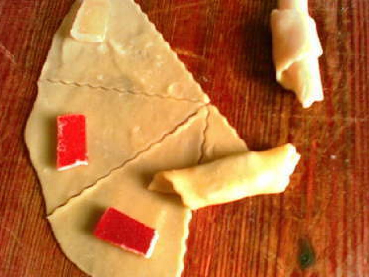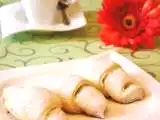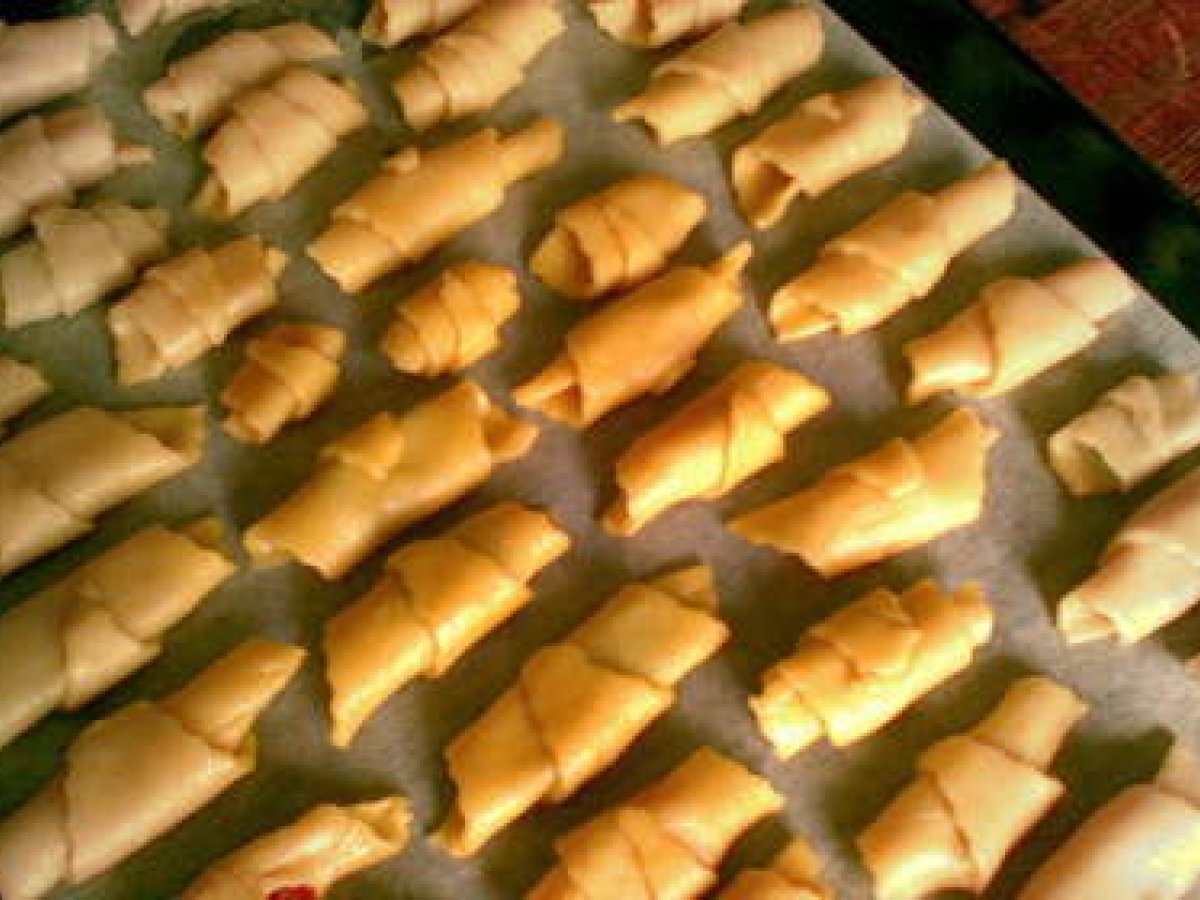 Faina se freaca bine cu untura.Adaugam galbenusurile frecate cu putina,smintina si framintam un aluat,pe care il lasam la odihnit 20-30 minute.Rupem din aluat cite o bucatica pe care o intindem cu sucitorul pe masa de lucru in forma de cerc.Taiem cercul obtinut in 8 cu ajutorul unui cutit sau pinten,iar la capatul cel lat punem umplutura,care poate sa fie:rahat,dulceata amestecata cu nuca macinata,fructe confiate,magiun de prune....Rulam de la exterior spre interior,le punem in tava pe hirtie de copt si le dam la cuptor pentru 20-25 minute(pina se rumenesc putin la capete).Calde le dam prin zahar pudra vanilat.POFTA BUNA!
