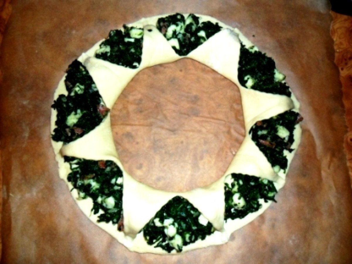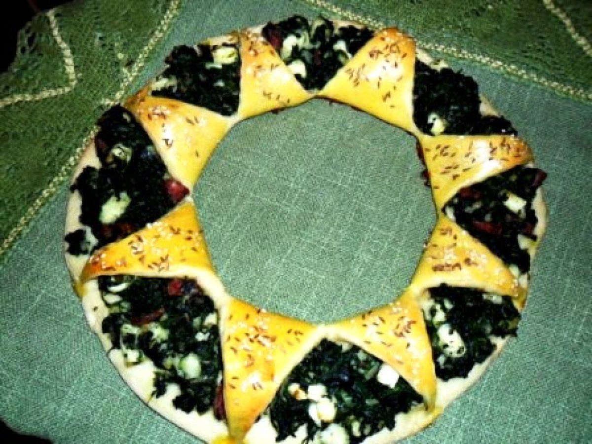 Coronite cu spanac, telemea si carnati votează acum PrecedentulUrmătorul DesertFoarte ușor50 min Trimite unui prieten Printează pagina Adresează o întrebare autorului Postează o poză cu rețeta gătită de tine Ingrediente 6 450 g. faina; 220 ml. apa; 60 g. unt topit; 2 lingurite sare; 1 lingurita zahar; drojdie cat o nuca; 1 kg. spanac; 1 ceapa uscata; 2 fire de ceapa verde; 8 catei de usturoi; 450 g. telemea; 200 g. carnati afumati uscati; ulei, piper, chimen, susan;