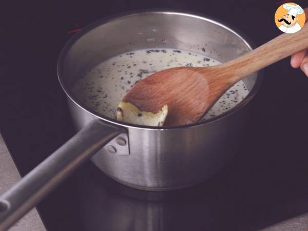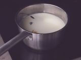 Puneți laptele într-o cratiță. Puneți la foc mediu și adăugați batonul de scorțișoară, coaja de lămâie, semințele de vanilie, păstaia de vanilie.