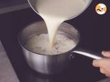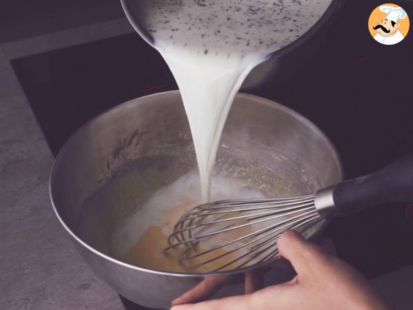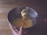 Turnați jumătate din amestecul de lapte în vasul care conține amestecul de gălbenuș + zahăr + amidon de porumb.