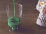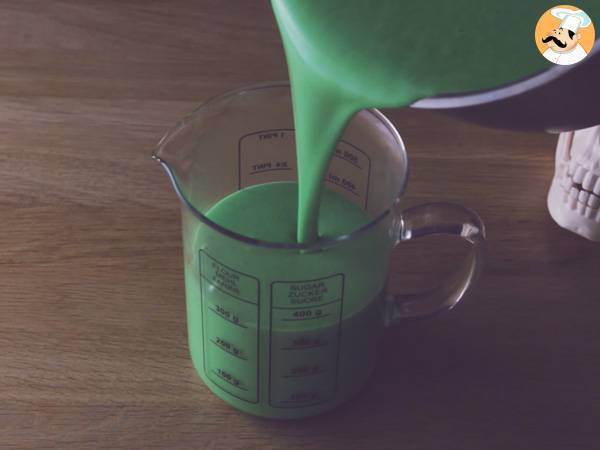 Umpleți paharele de plastic cu cremă verde până aproape de vârful cicatricii lui Frankenstein.