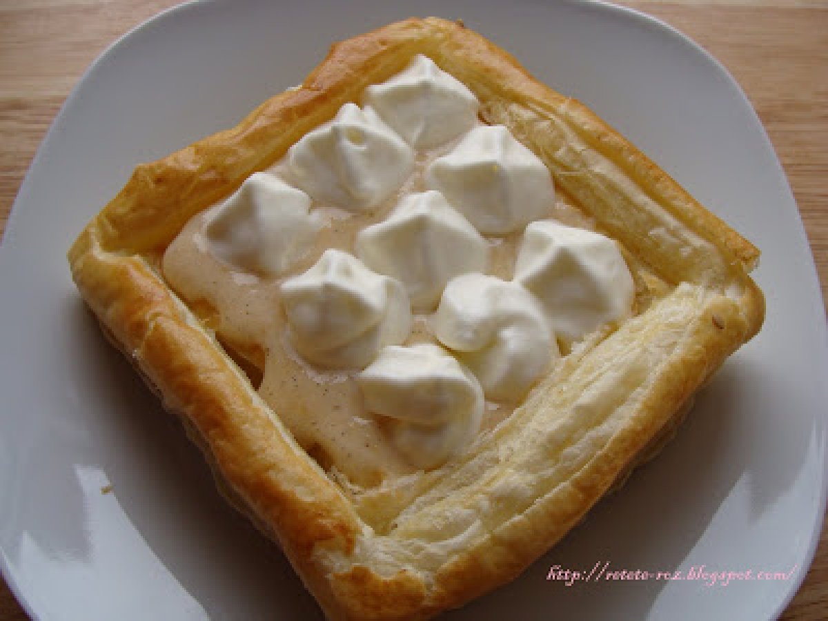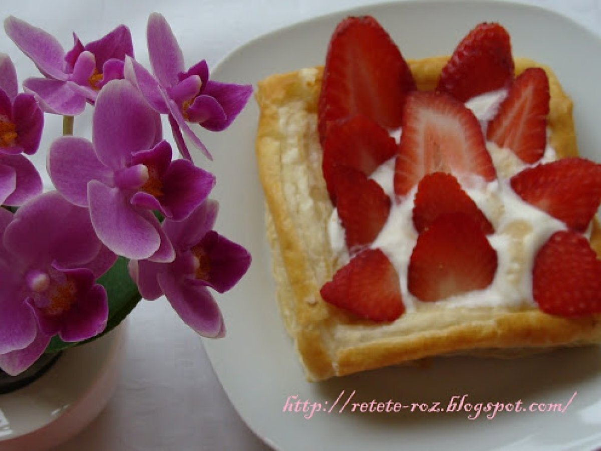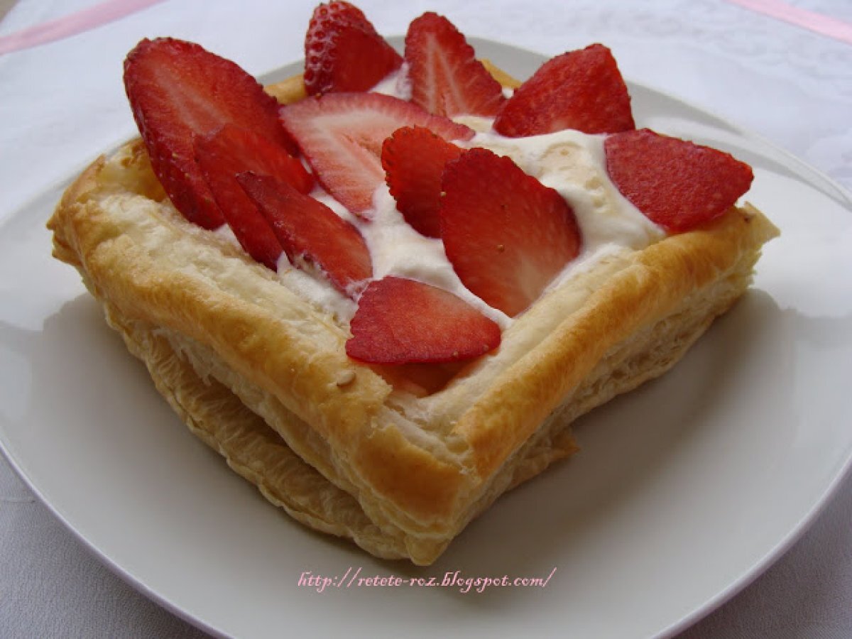 Cremes cu capsuni PrecedentulUrmătorul DesertFoarte ușor45 min Trimite unui prieten Printează pagina Adresează o întrebare autorului Postează o poză cu rețeta gătită de tine Ingrediente 7 250 g aluat de foietaj 200 ml lapte 3 oua plus un ou pentru uns patratelele de foietaj 2 linguri de faina sau amidon 3 linguri de zahar 1 baton de vanilie 250 ml frisca naturala 2 linguri zahar pudra capsuni