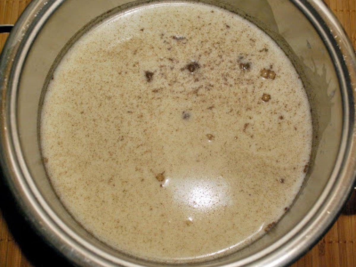 - Cand laptele incepe sa fiarba, se dauga spuma de albusuri treptat, nu toata odata si se amesteca bine cu lingura, specificatii, oala in care fierbeti laptele sa fie destul de mare ca sa incapa si spuma de albusuri.