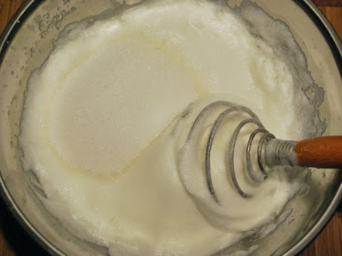 - Laptele se pune la fiert impreuna cu vanilia, albusurile se bat spuma, pana fac tepi, apoi se adauga zaharul si se bate bine pana se obtine o spuma tare si lucioasa.