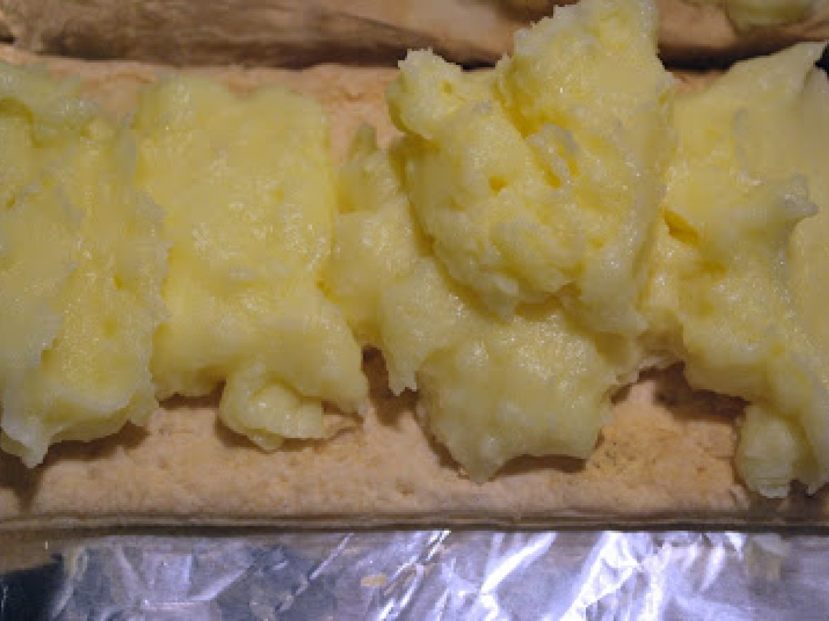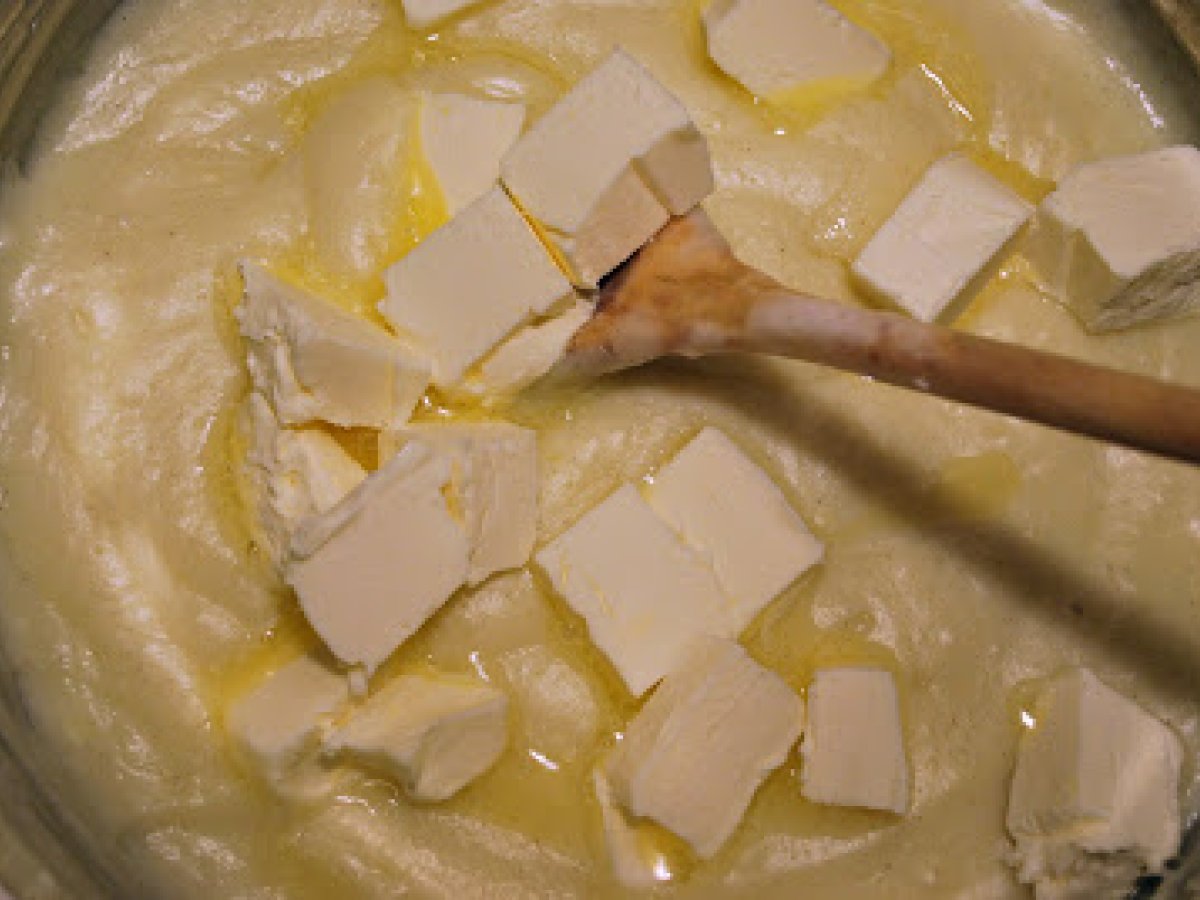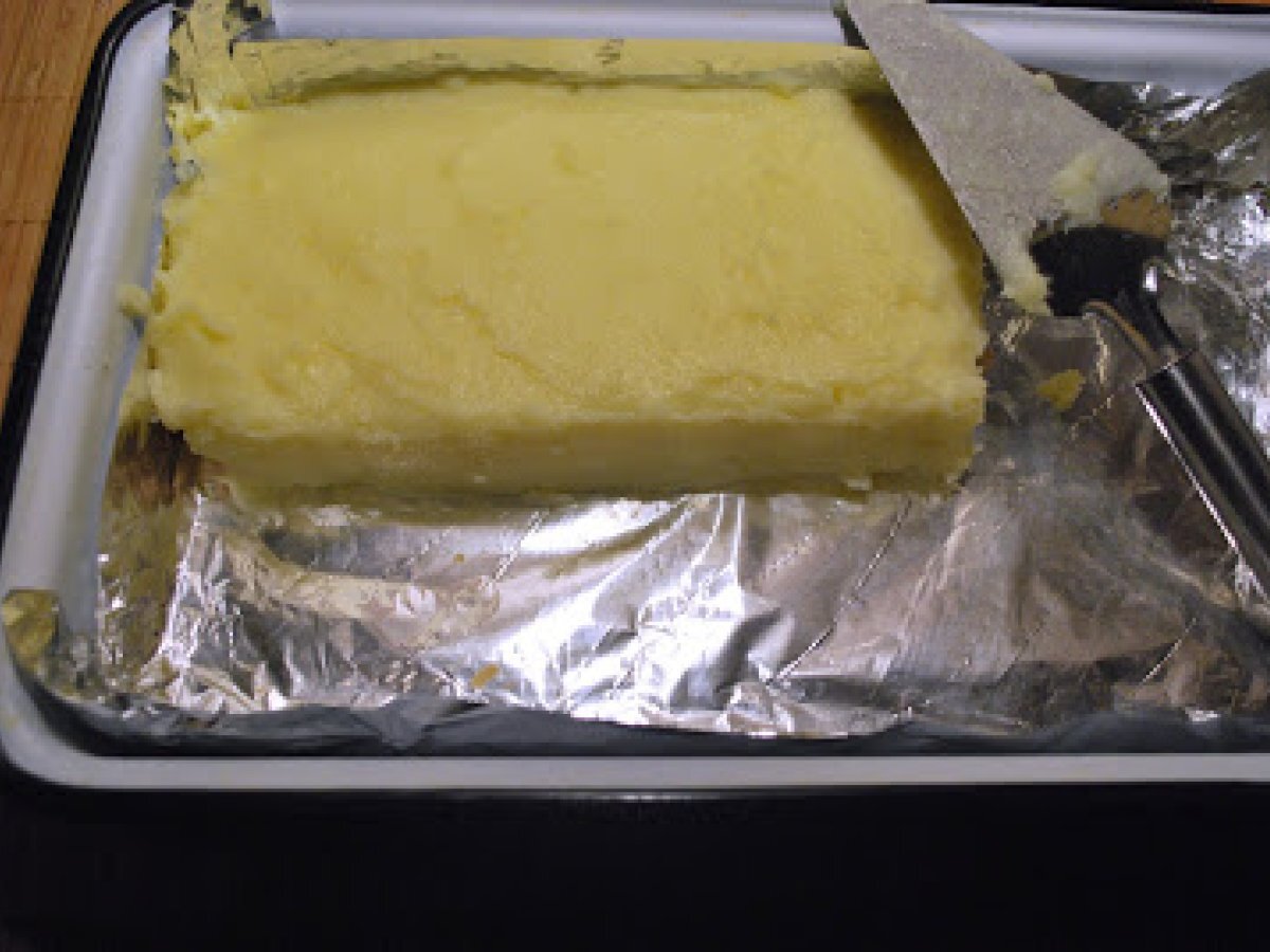- Cand este calduta se incorporeaza untul taiat cubulete, crema se da la rece sa se intareasca bine, se pune pe foaie, se netezeste bine