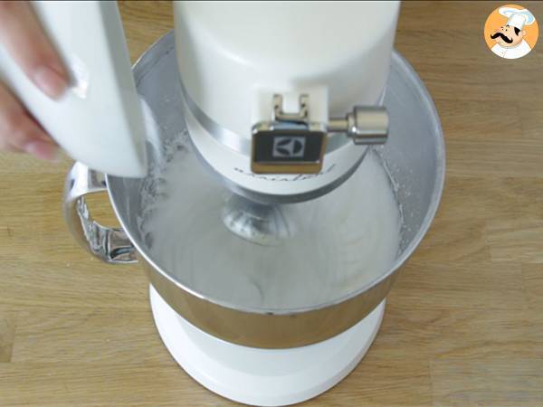 Incepeti sa bateti albusurile cu puțin zahar, intai la viteza mica. Cand incepe sa formeze o spuma, accelerați viteza mixerului si turnati zaharul pe masura ce creste albusul.