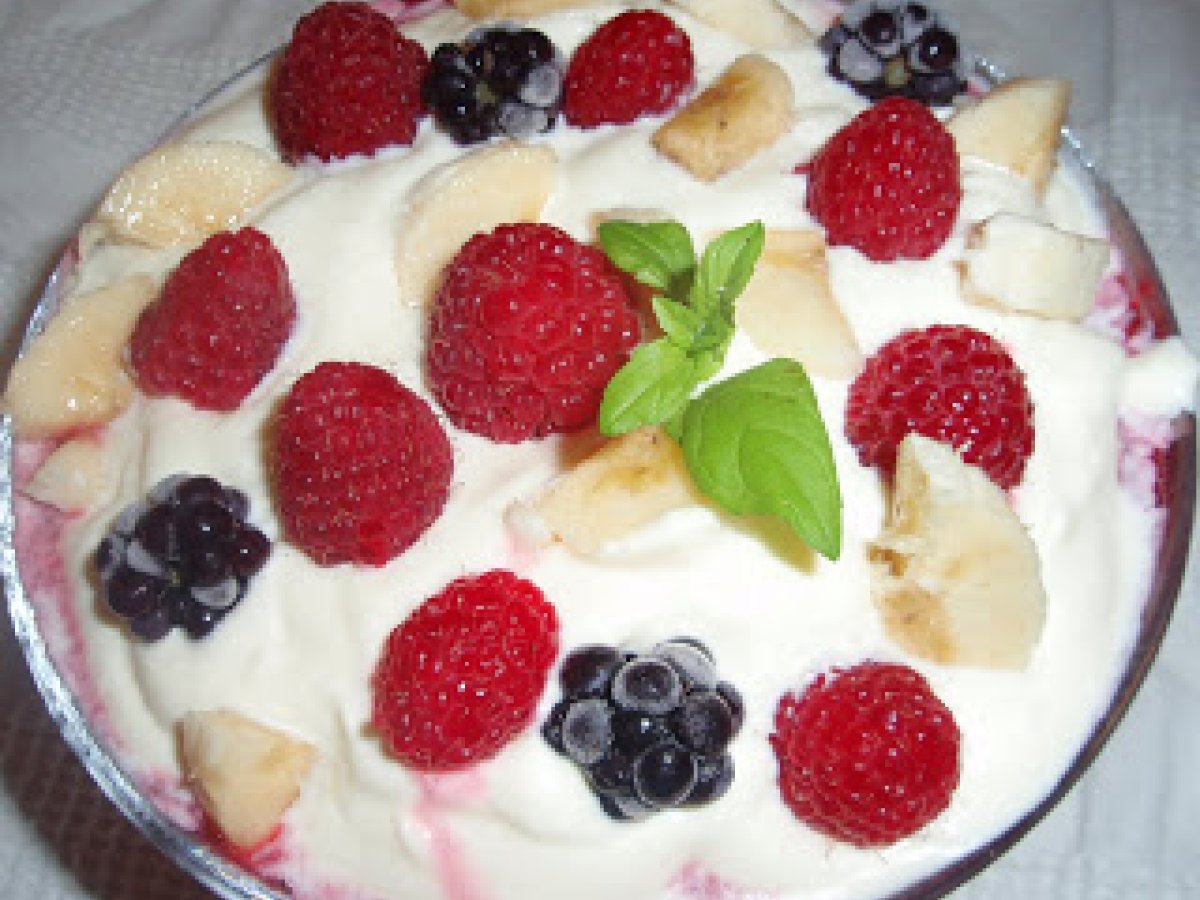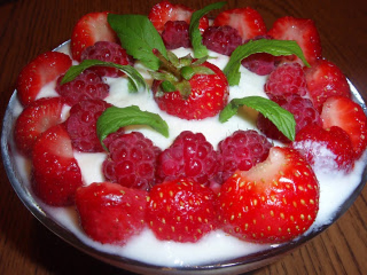 Delicii cu fructe : zmeura, capsuni, banane, mure PrecedentulUrmătorul DesertFoarte ușor40 min Trimite unui prieten Printează pagina Adresează o întrebare autorului Postează o poză cu rețeta gătită de tine Ingrediente 4 150 g capsuni /o banana si cateva mure 150 g zmeura 1 iaurt mare (450g) sau 2 iaurturi mici de 125 g si o cutie 200 g smantana dulce 3-4 linguri de miere cateva frunze de menta