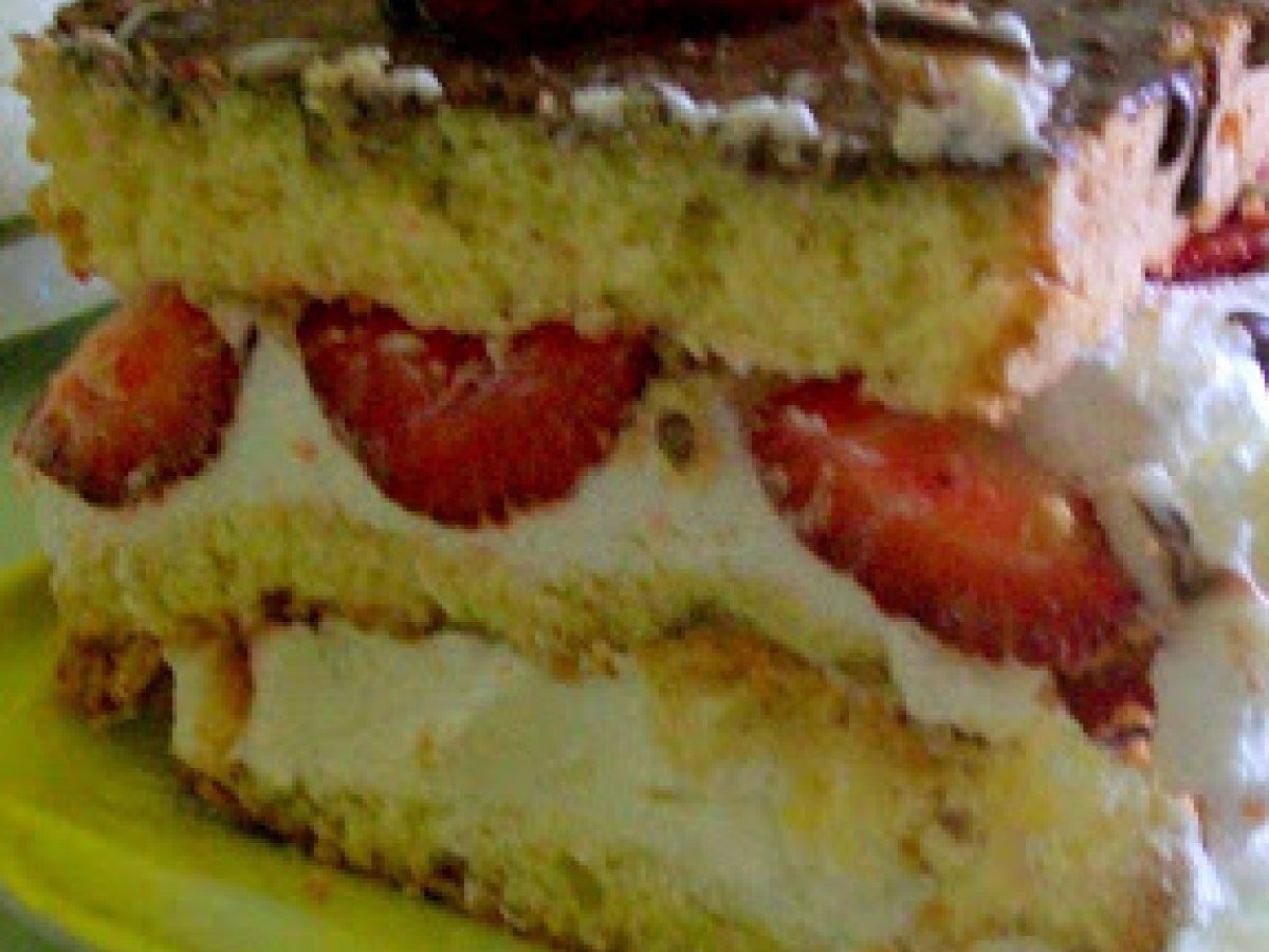 Delicii de mai-prajitura cu frisca si capsuni PrecedentulUrmătorul DesertFoarte ușor1 h 10 m Trimite unui prieten Printează pagina Adresează o întrebare autorului Postează o poză cu rețeta gătită de tine Ingrediente 6 400-500 g capsuni proaspete 400 g frisca lichida 3 linguri smantana 4 oua un pahar zahar un pahar faina 3 linguri ulei un praf sare esenta vanilie glazura de ciocolata(la plic-minunata!)
