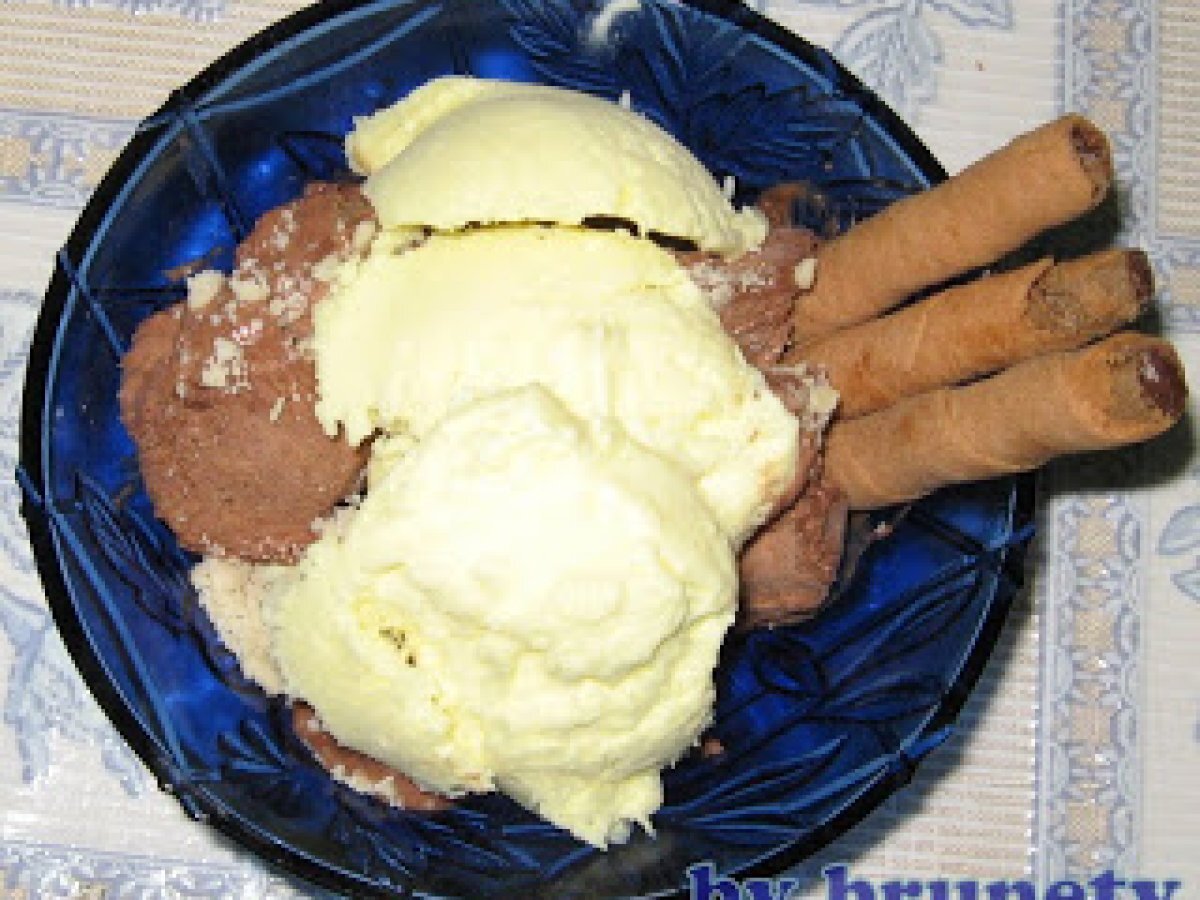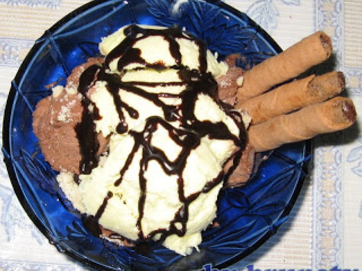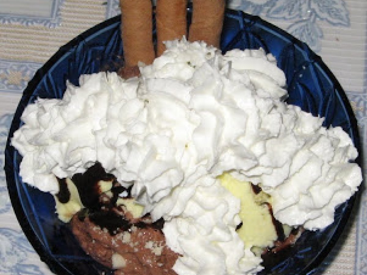Desert rapid cu inghetata PrecedentulUrmătorul DesertFoarte ușor40 min Trimite unui prieten Printează pagina Adresează o întrebare autorului Postează o poză cu rețeta gătită de tine Un desert rapid si foarte bun. Ingrediente 4 300 g inghetata cu vanilie 300 g inghetata cu ciocolata 250 ml frisca la tub sirop de ciocolata Nesquik 1 punga de napolitane vieneze cu crema de cacao Naty 50 g alune decojite crude