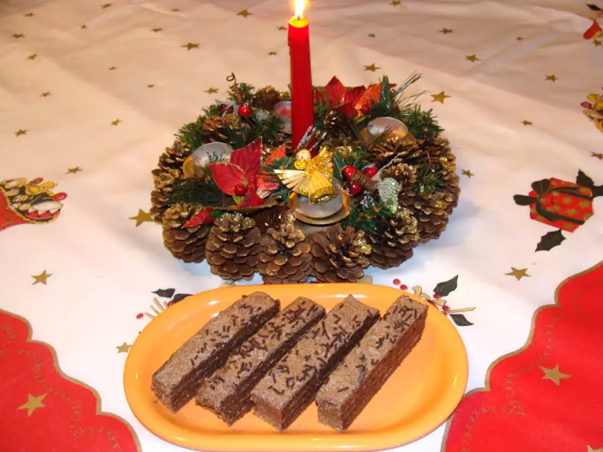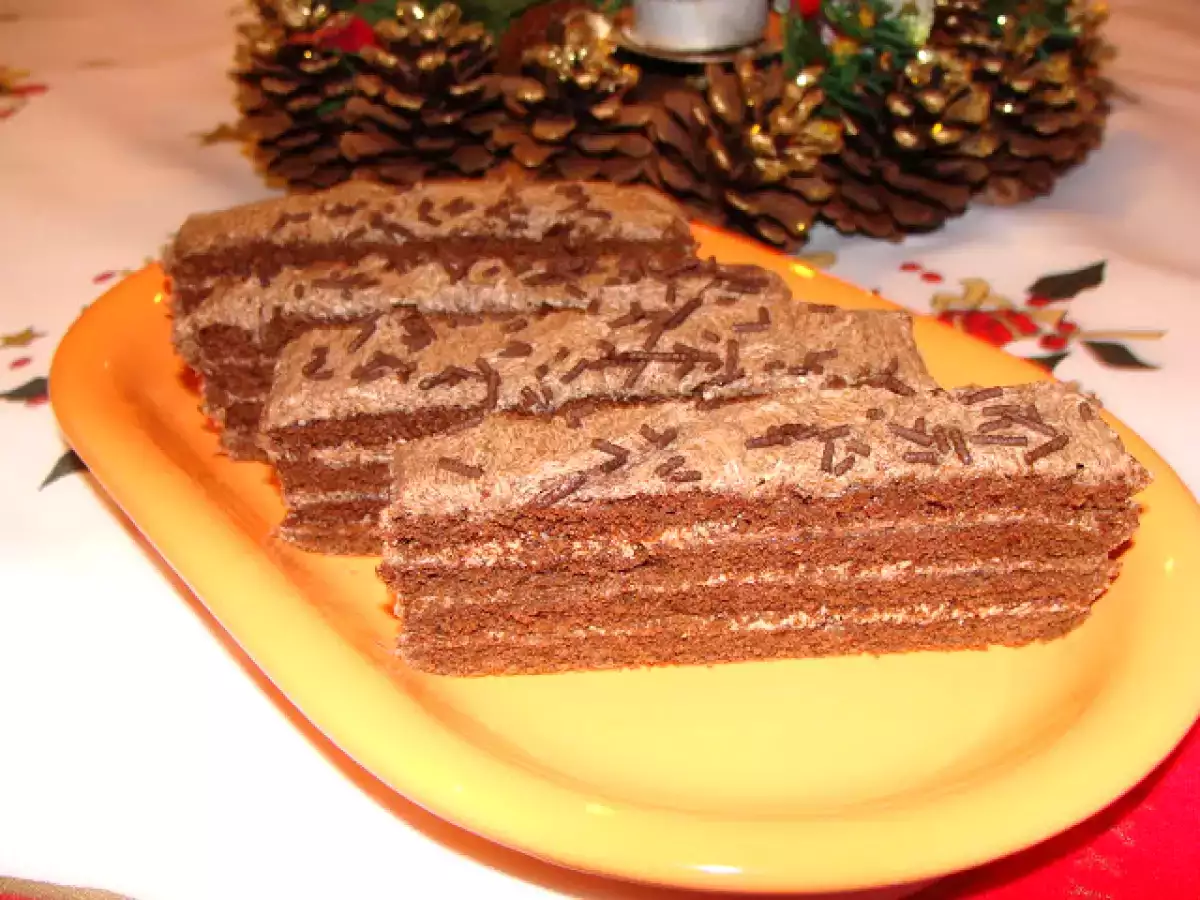 Dulce pentru craciun: prajitura crem-caffe PrecedentulUrmătorul DesertFoarte ușor50 min Trimite unui prieten Printează pagina Adresează o întrebare autorului Postează o poză cu rețeta gătită de tine Ingrediente 4 INGREDIENTE pentru foi: 4 foi de pandispan ( un pachet) sau . . . 2 oua 9 linguri zahar 9 linguri lapte 9 linguri ulei 3 plicuri zahar vanilinat 1 praf sare 1 lingurita amoniac faina cat cuprinde INGREDIENTE pentru crema: 3 oua 150 g zahar+4 linguri 250 g margarina 3 linguri cacao 2 lingurite cafea instant 6 linguri apa