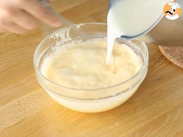 Puneti laptele la fiert. Intre timp, frecati galbenusurile cu zaharul pana cand amestecul se albeste si devine cremos. Apoi adaugati amidonul de porumb si amestecati bine.