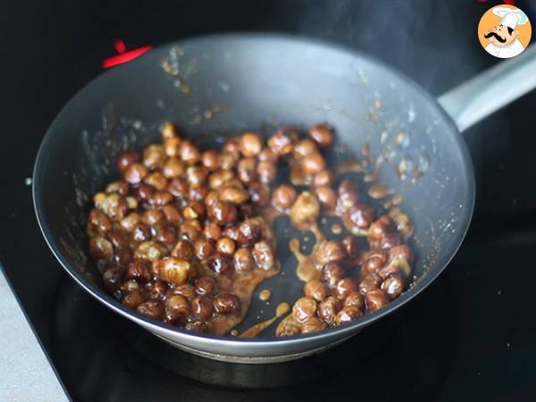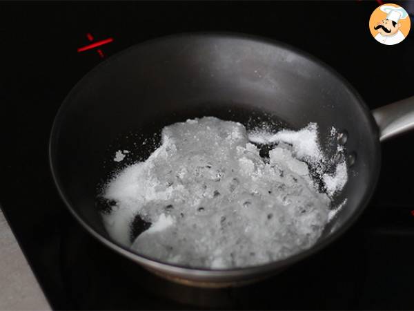 Puneti apa si zaharul intr-o tigaie la foc mediu. Cand amestecul formeaza bule, adaugati alunele.