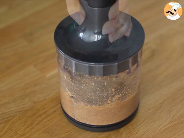 Odata racit, spargeti niste bucati de alune caramelizate si puneti-le intr-un chopper. Se amesteca in perioade de 30 de secunde timp de aproximativ 5 minute pentru a evita supraincalzirea motorului si pentru obtine un aluat.
