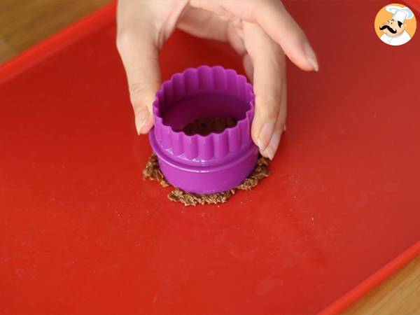 Imediat dupa aceea, realizati 6 gramezi mici din acest amestec pe o hartie de pergament sau silicon si intindeti-le in cercuri de acelasi diametru cu jumatatile de sfera (utilizati un taietor de biscuiti pentru a fi cat mai precis). Odata ce aceste cercuri sunt gata, pastrati-le la rece pana la utilizare.